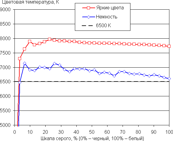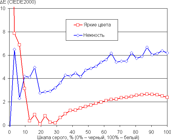 Баланс оттенков на шкале серого после выбора профиля Нежность хороший — цветовая температура достаточно близка к стандартным 6500 К, при этом на значимом участке шкалы серого этот параметр изменяется не очень сильно, что улучшает визуальное восприятие баланса цветов. Отклонение от спектра абсолютно черного тела (ΔE) ниже 10 единиц, что для потребительского устройства считается хорошим показателем, и разброс этой характеристики также не очень большой: