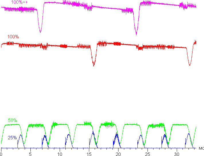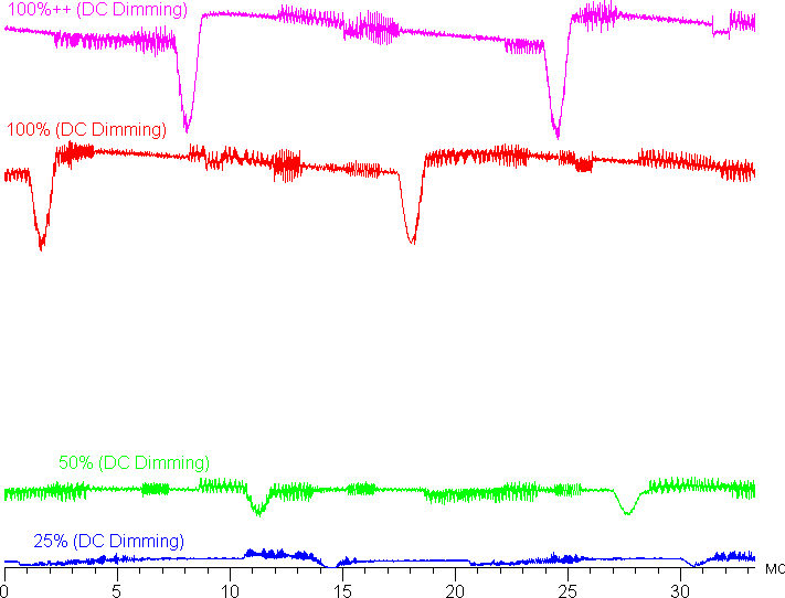 На любом уровне яркости присутствует значимая модуляция с частотой примерно 61 или 244 Гц. На рисунке ниже приведены зависимости яркости (вертикальная ось) от времени (горизонтальная ось) для нескольких значений настройки яркости.