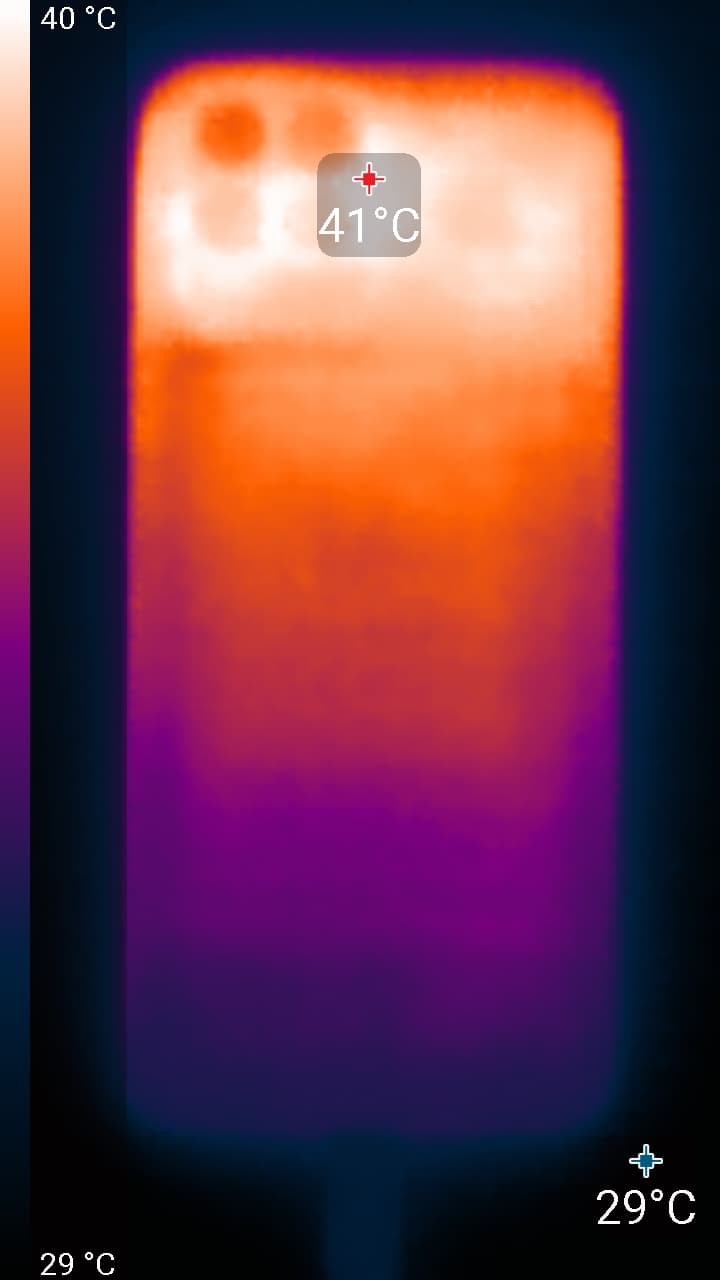 Нагрев больше в верхней части аппарата, что, видимо, соответствует расположению микросхемы SoC. По данным теплокамеры, максимальный нагрев составил 41 градус (при температуре окружающего воздуха в 24 градуса), это средний нагрев в данном тесте для современных смартфонов.