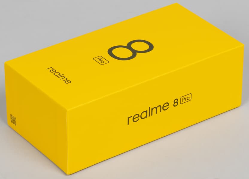 Realme 8 Pro поставляется в яркой картонной коробке, оформленной в фирменных корпоративных цветах бренда — желтом и темно-сером.