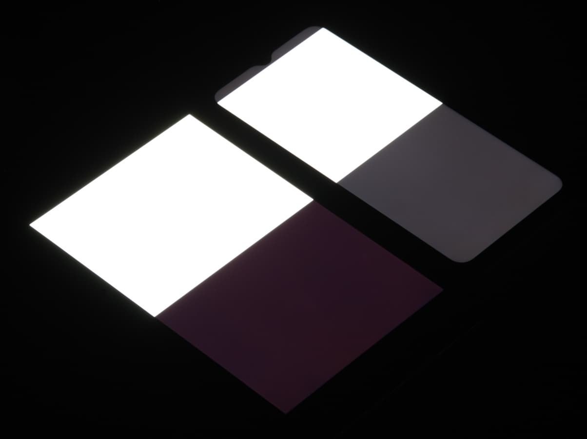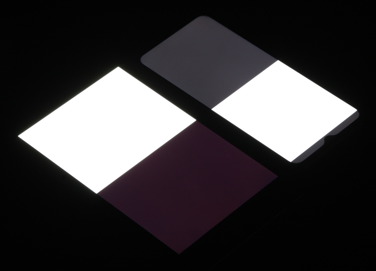 Яркость под углом у экранов уменьшилась (как минимум в 5 раз, исходя из разницы в выдержке), но в случае Realme C15 яркость снизилась сильнее. Черное поле при отклонении по диагонали сильно высветляется, но остается условно нейтрально-серым. Фотографии ниже это демонстрируют (яркость белых участков в перпендикулярном плоскости экранов направлении одинаковая!):