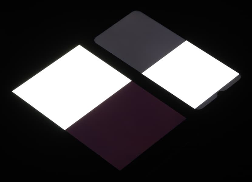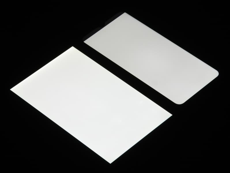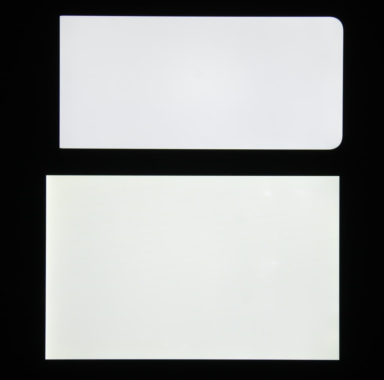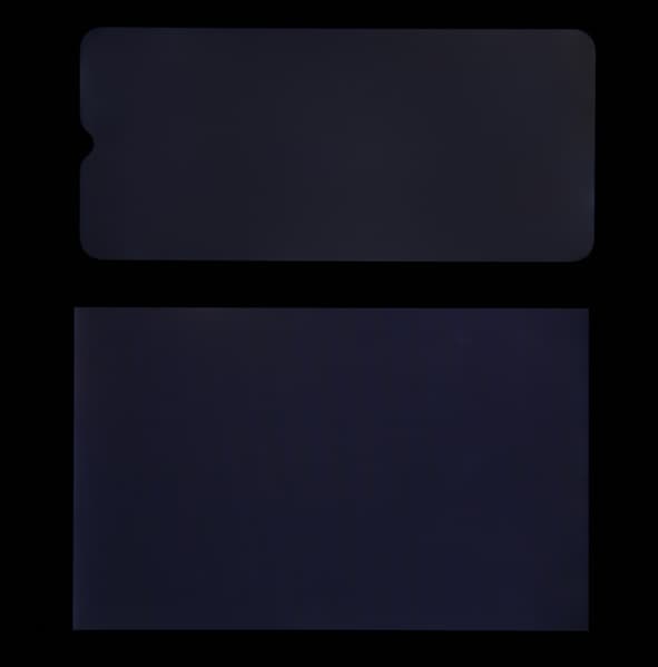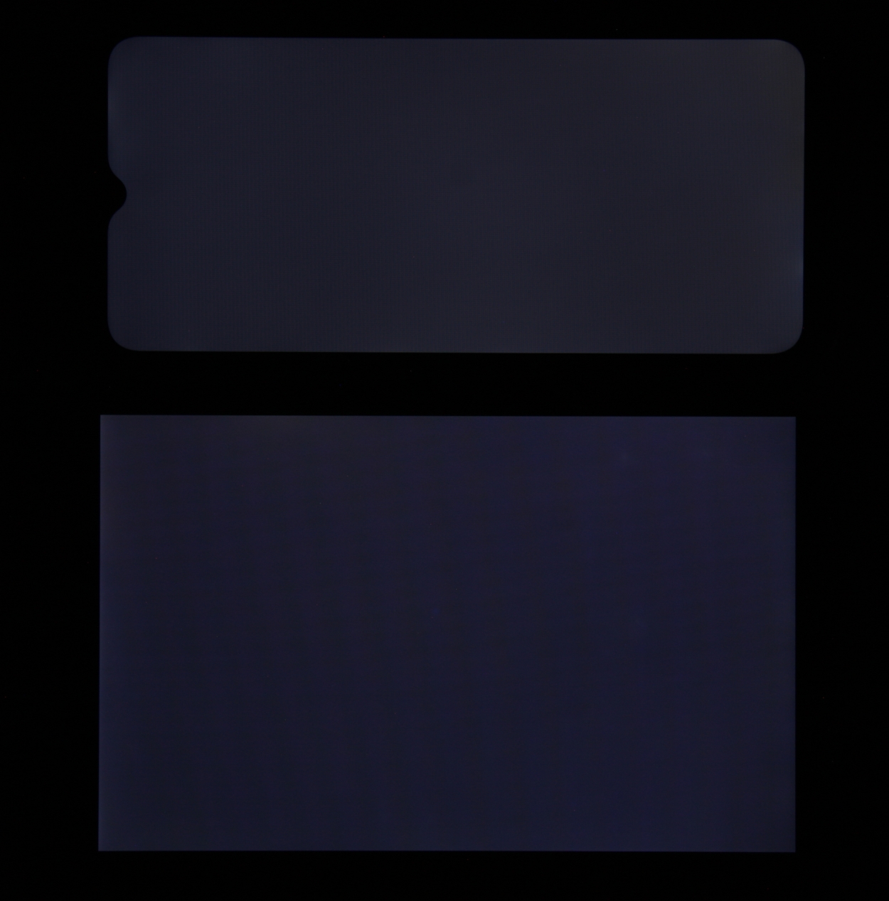 При перпендикулярном взгляде равномерность черного поля хорошая — в паре мест близко краю черный чуть высветлен (для наглядности яркость подсветки на смартфоне установлена на максимум):