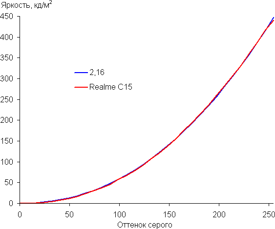 Контрастность (примерно в центре экрана) высокая — порядка 1500:1. Время отклика при переходе черный-белый-черный равно 21 мс (12 мс вкл. + 9 мс выкл.). Переход между полутонами серого 25% и 75% (по численному значению цвета) и обратно в сумме занимает 36 мс. Построенная по 32 точкам с равным интервалом по численному значению оттенка серого гамма-кривая не выявила завала ни в светах, ни в тенях. Показатель аппроксимирующей степенной функции равен 2,16, что близко к стандартному значению 2,2. При этом реальная гамма-кривая немного отклоняется от степенной зависимости: