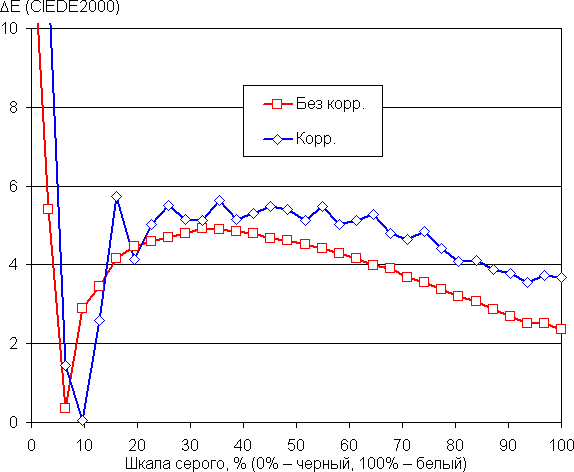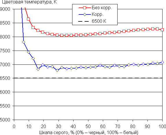 Результат после ручной коррекции (мы сдвинули ползунок в крайнее правое положение) получше (см. графики ниже), поскольку цветовая температура снижается, а отклонение от спектра абсолютно черного тела (ΔE) на большей части шкалы серого остается ниже 10, что для потребительского устройства считается приемлемым показателем. При этом цветовая температура и ΔE мало изменяются от оттенка к оттенку — это положительно сказывается на визуальной оценке цветового баланса. (Самые темные области шкалы серого можно не учитывать, так как там баланс цветов не имеет большого значения, да и погрешность измерений цветовых характеристик на низкой яркости большая.)