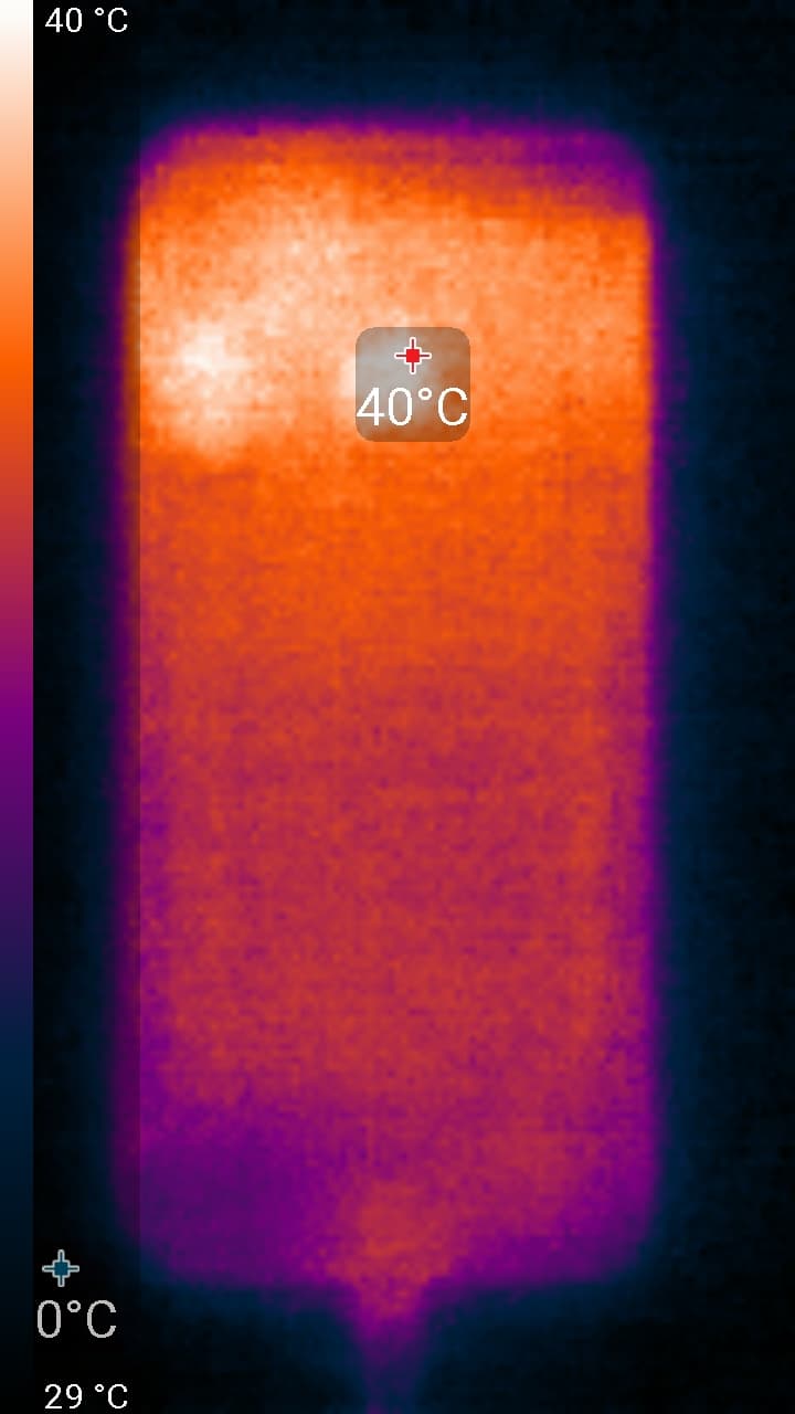 Нагрев выше в верхней правой части аппарата, что, видимо, соответствует расположению микросхемы SoC. По данным теплокамеры, максимальный нагрев составил 40 градусов (при температуре окружающего воздуха в 24 градуса), это средний нагрев для данного теста среди современных смартфонов.