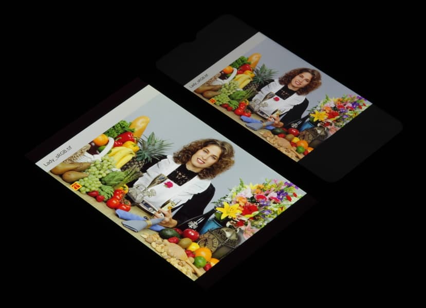 Экран имеет хорошие углы обзора без значительного сдвига цветов даже при больших отклонениях взгляда от перпендикуляра к экрану и без инвертирования оттенков. Для сравнения приведем фотографии, на которых на экраны Realme C15 и Nexus 7 выведены одинаковые изображения, при этом яркость экранов изначально установлена примерно на 200 кд/м², а цветовой баланс на фотоаппарате принудительно переключен на 6500 К.