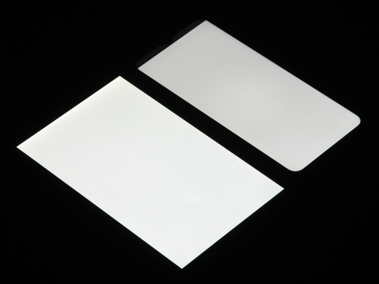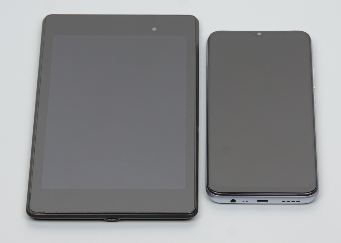 Лицевая поверхность экрана выполнена в виде стеклянной пластины с зеркально-гладкой поверхностью, устойчивой к появлению царапин. Судя по отражению объектов, антибликовые свойства экрана лучше, чем у экрана Google Nexus 7 (2013) (далее просто Nexus 7). Для наглядности приведем фотографию, на которой в выключенных экранах отражается белая поверхность (слева — Nexus 7, справа — Realme C15, далее их можно различать по размеру):
