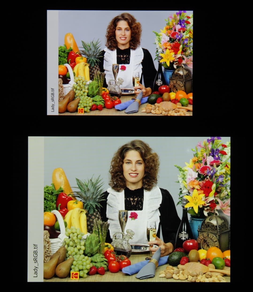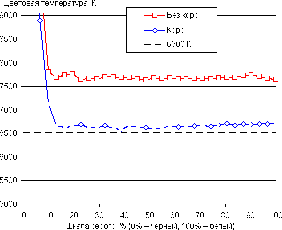 Результат после ручной коррекции (крайнее правое положение ползунка) хороший, так как цветовая температура становится достаточно близкой к стандартным 6500 К, а отклонение от спектра абсолютно черного тела (ΔE) остается ниже 10, что для потребительского устройства считается приемлемым показателем. При этом цветовая температура и ΔE мало изменяются от оттенка к оттенку — это положительно сказывается на визуальной оценке цветового баланса. (Самые темные области шкалы серого можно не учитывать, так как там баланс цветов не имеет большого значения, да и погрешность измерений цветовых характеристик на низкой яркости большая.)