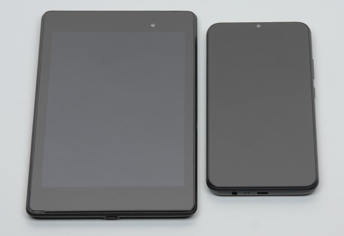 Лицевая поверхность экрана выполнена в виде стеклянной пластины с зеркально-гладкой поверхностью, устойчивой к появлению царапин. Судя по отражению объектов, антибликовые свойства экрана лучше, чем у экрана Google Nexus 7 (2013) (далее просто Nexus 7). Для наглядности приведем фотографию, на которой в выключенных экранах отражается белая поверхность (слева — Nexus 7, справа — Realme C21, далее их можно различать по размеру):