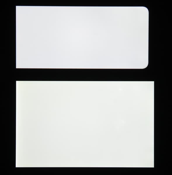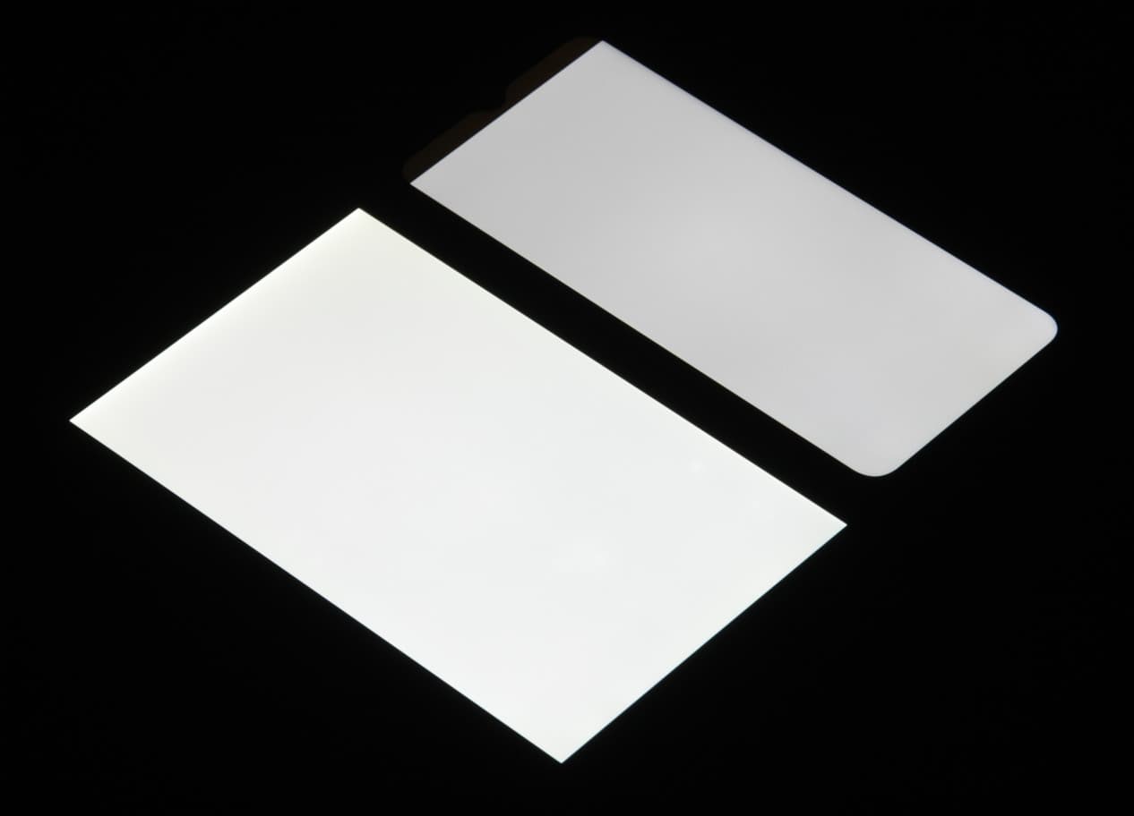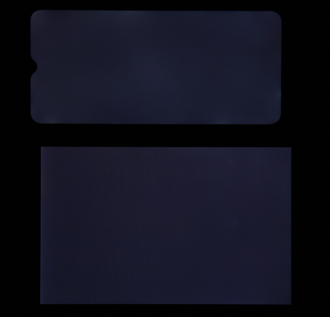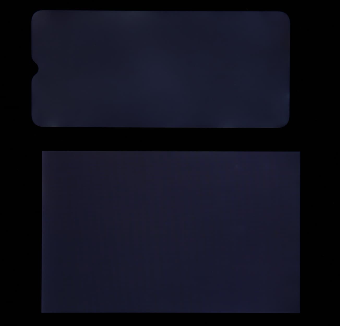 При перпендикулярном взгляде равномерность черного поля средняя — нескольких местах близко краю черный высветляется (для наглядности яркость подсветки на смартфоне установлена на максимум):