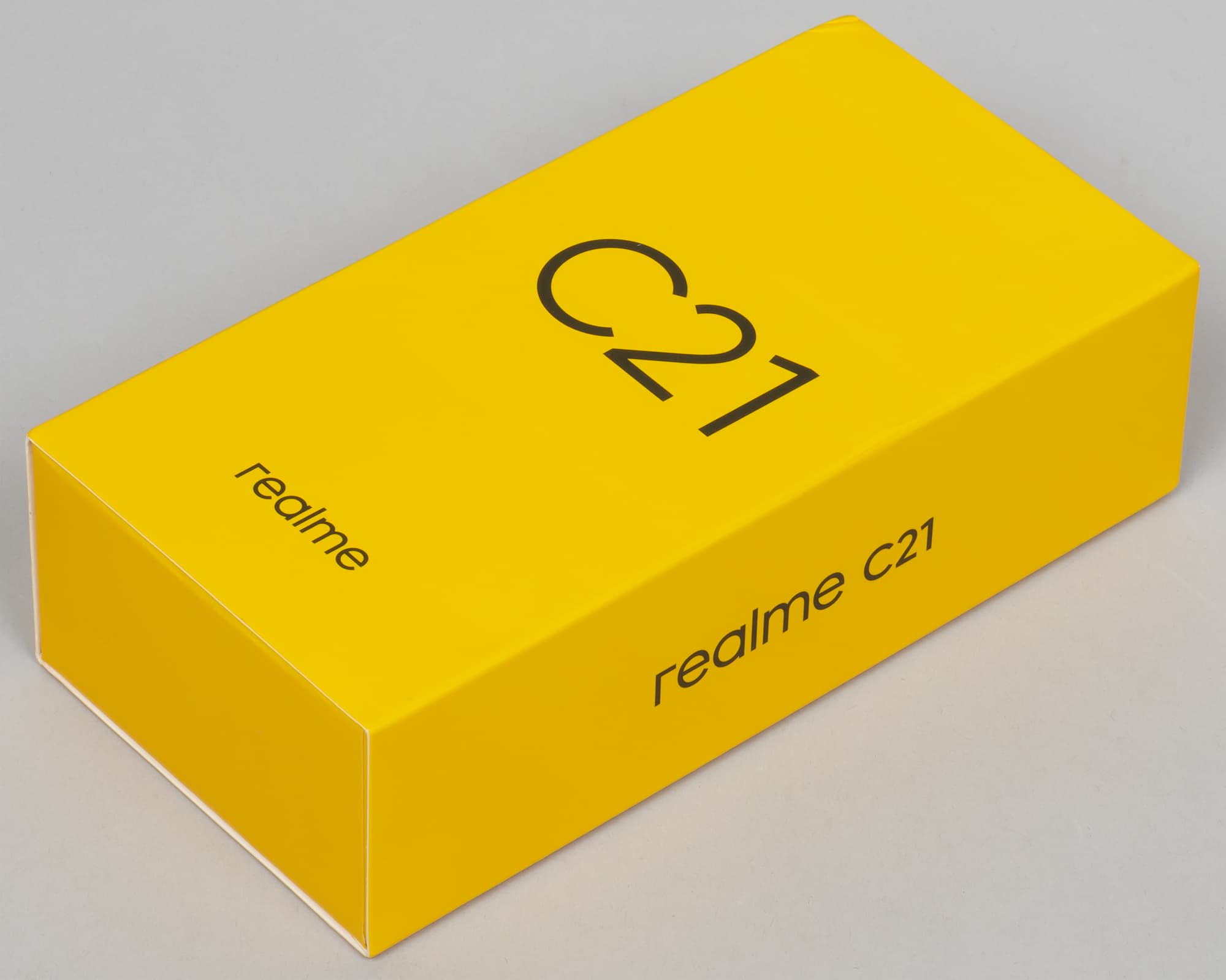 Смартфон Realme C21 поставляется в яркой картонной коробке, оформленной в фирменных цветах бренда: желтом и темно-сером.