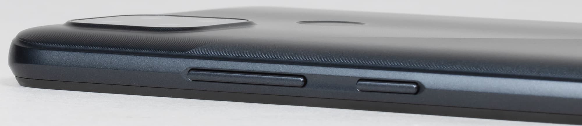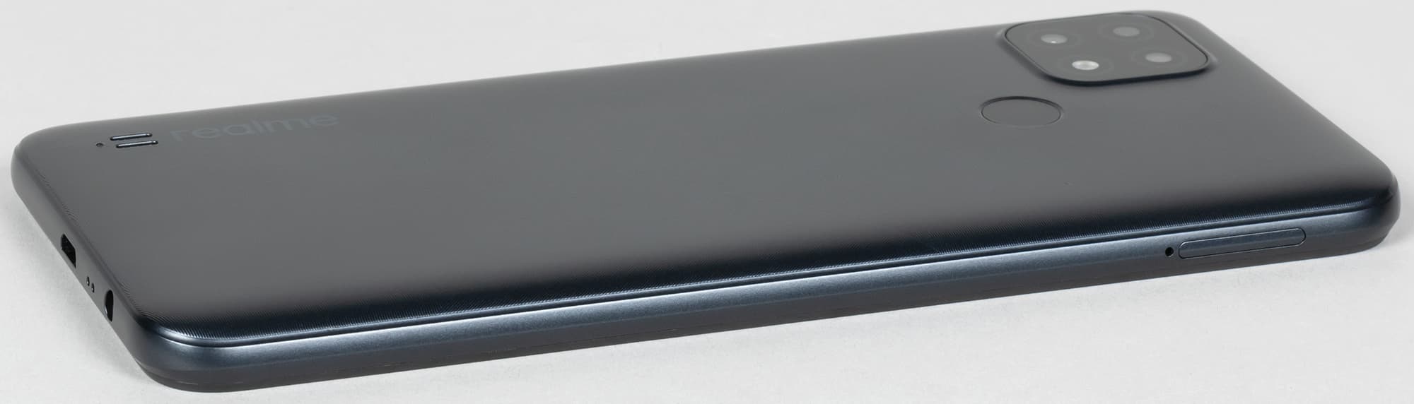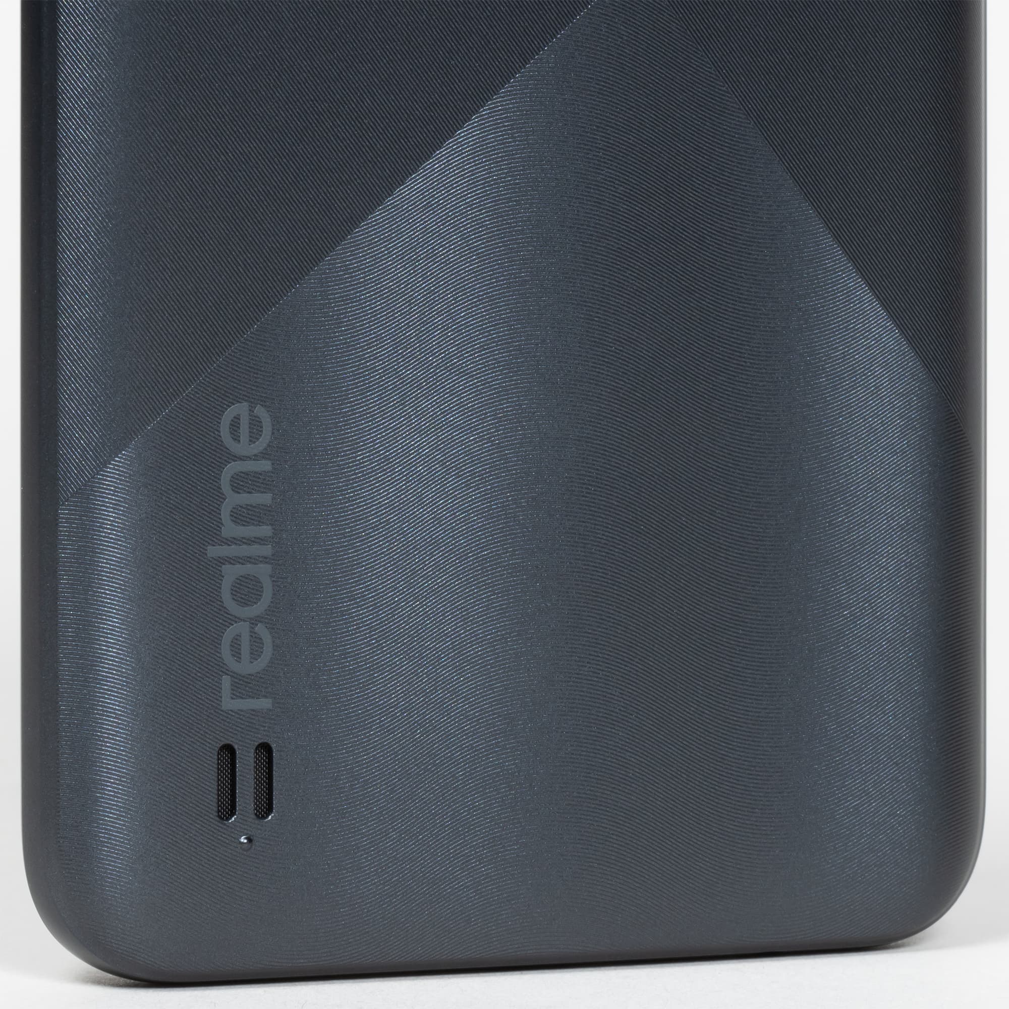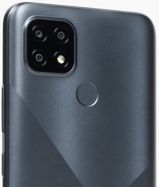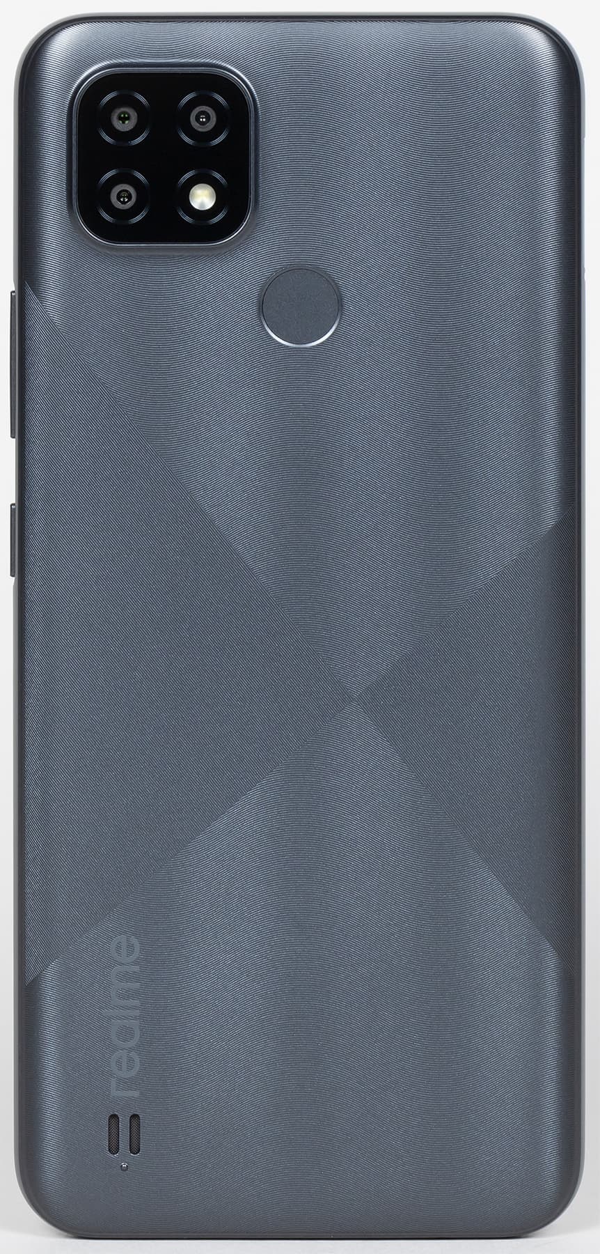 Realme C21 оформлен в точно таком же неброском, но практичном стиле, как и все его сородичи по серии Realme С. Здесь нет глянца и блестяшек, корпус выполнен из матовой пластмассы с нанесенной на нее мелкой текстурой в виде геометрического рисунка. Благодаря ей смартфон не скользит в руке и не собирает отпечатки пальцев на своей шероховатой поверхности.