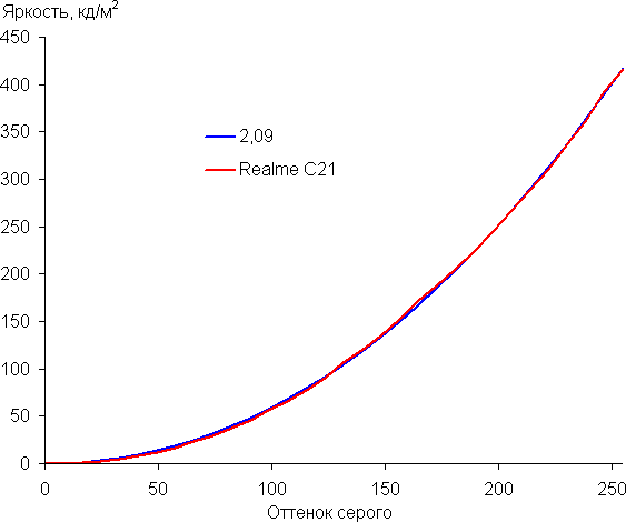 Контрастность (примерно в центре экрана) высокая — порядка 1600:1. Время отклика при переходе черный-белый-черный равно 26 мс (16 мс вкл. + 10 мс выкл.). Переход между полутонами серого 25% и 75% (по численному значению цвета) и обратно в сумме занимает 42 мс. Построенная по 32 точкам с равным интервалом по численному значению оттенка серого гамма-кривая не выявила завала ни в светах, ни в тенях. Показатель аппроксимирующей степенной функции равен 2,09, что ниже стандартного значения 2,2. При этом реальная гамма-кривая немного отклоняется от степенной зависимости:
