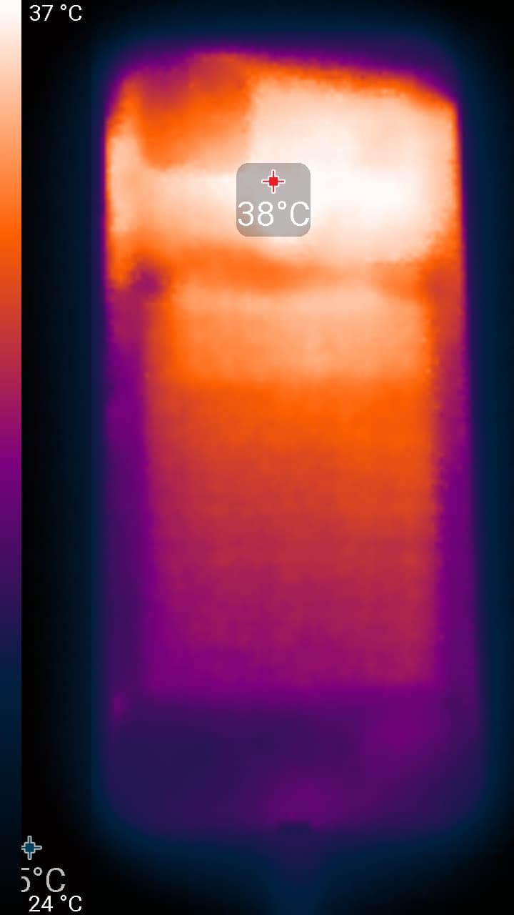 Нагрев выше в верхней части аппарата, что, видимо, соответствует расположению микросхемы SoC. По данным теплокамеры, максимальный нагрев составил 38 градусов (при температуре окружающего воздуха в 24 градуса), это не очень много.