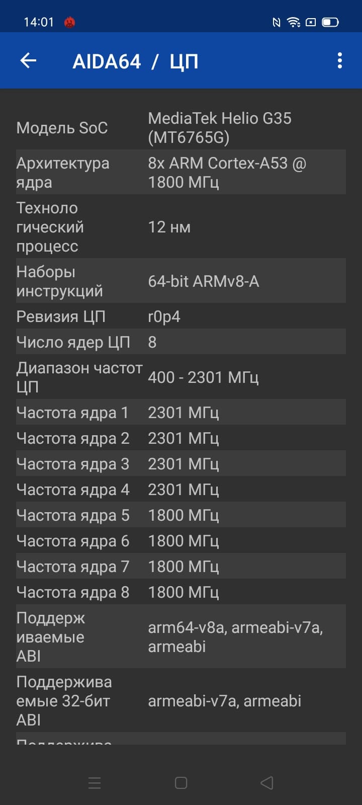 - SoC MediaTek Helio G35, 8 ядер (4×Cortex-A53 @2,3 ГГц и 4×Cortex-A53 @1,8 ГГц)