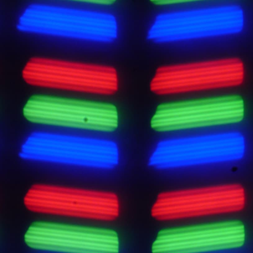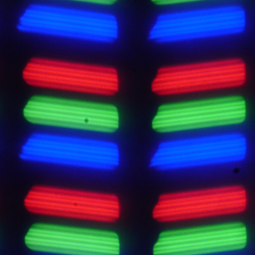 В данном смартфоне используется матрица типа IPS. Микрофотографии демонстрируют типичную для IPS структуру субпикселей: