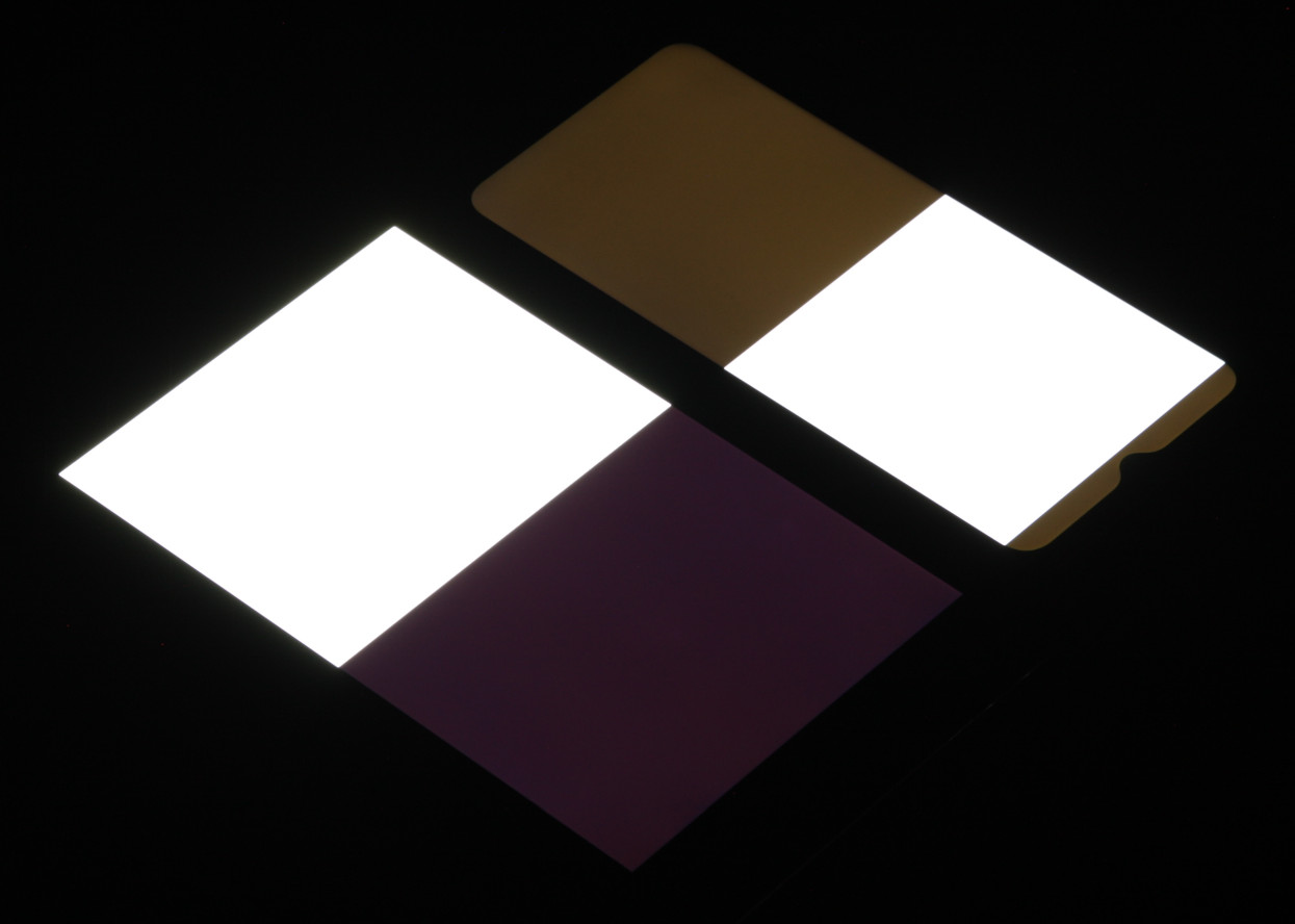 Яркость под углом у экранов уменьшилась (как минимум в 5 раз, исходя из разницы в выдержке), но в случае Realme C21 яркость снизилась сильнее. Черное поле при отклонении по диагонали сильно высветляется и приобретает легкий коричневатый оттенок. Фотографии ниже это демонстрируют (яркость белых участков в перпендикулярном плоскости экранов направлении одинаковая!):