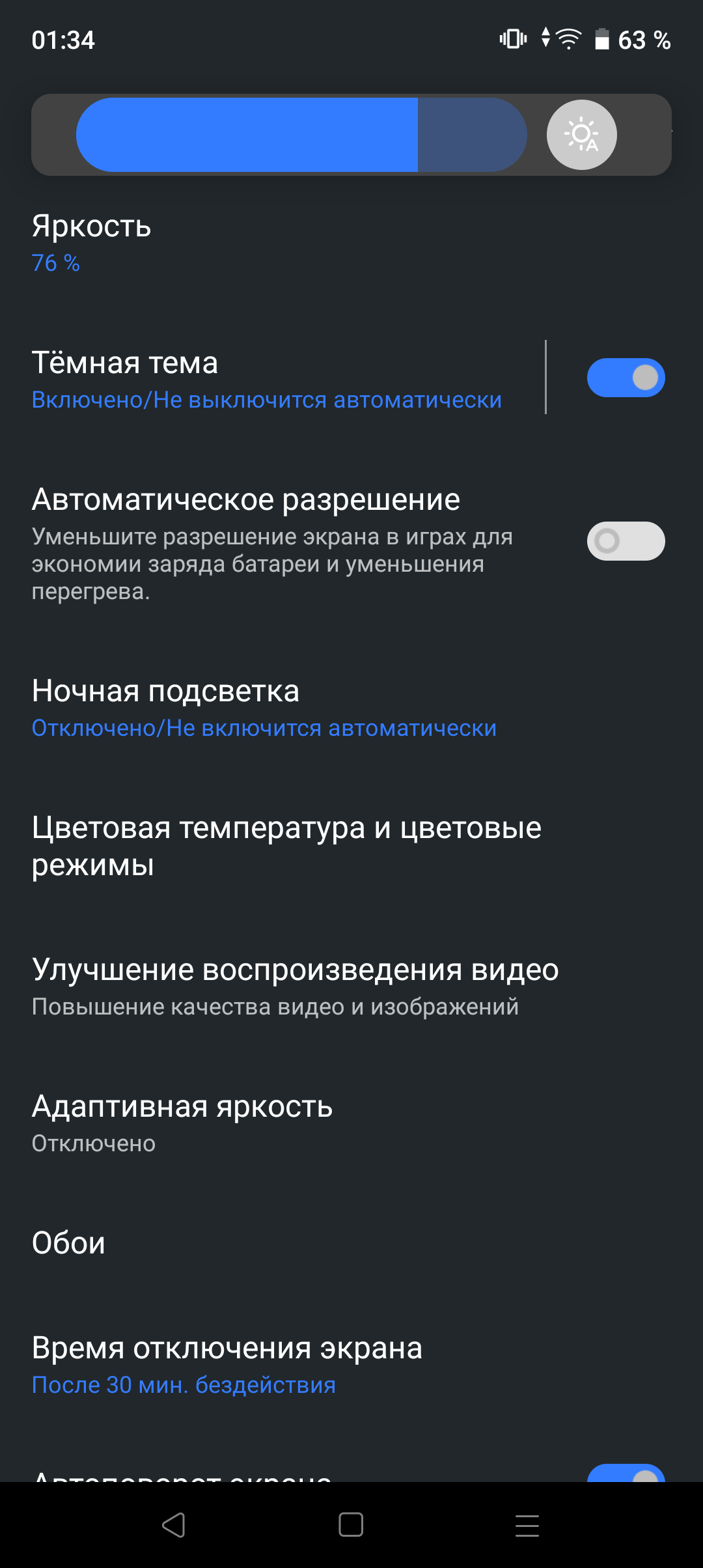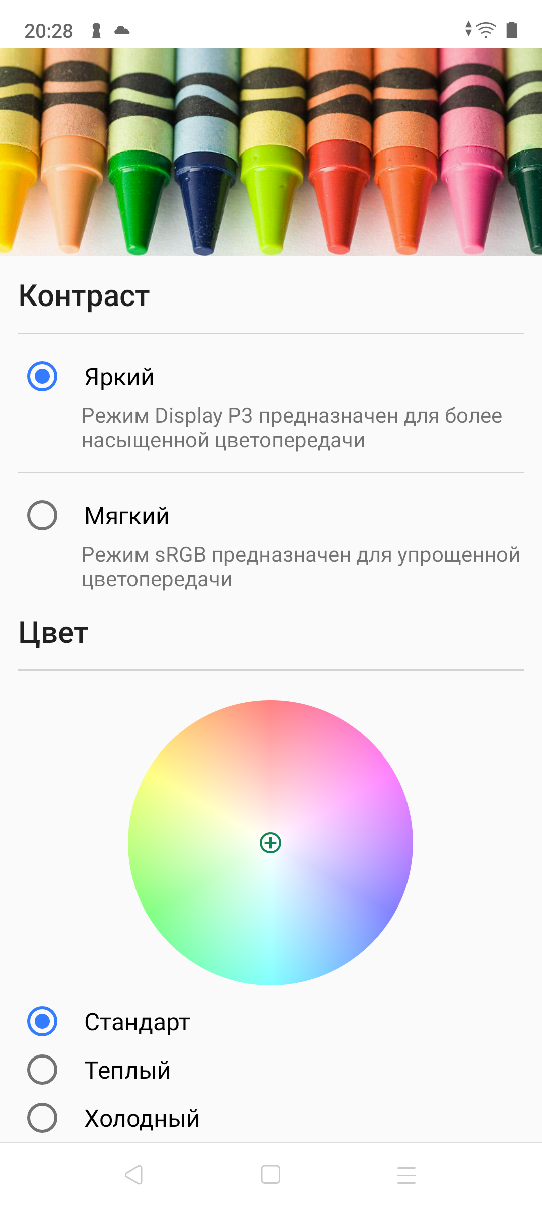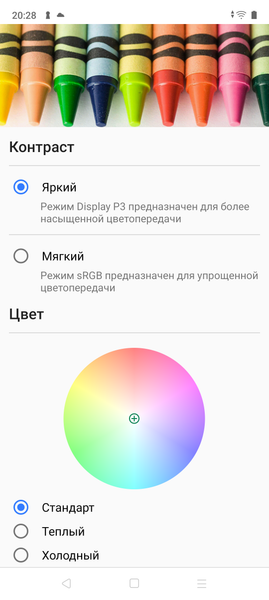 Фотография выше получена для профиля Яркий в настройках экрана, который выбран по умолчанию. Профилей всего два: