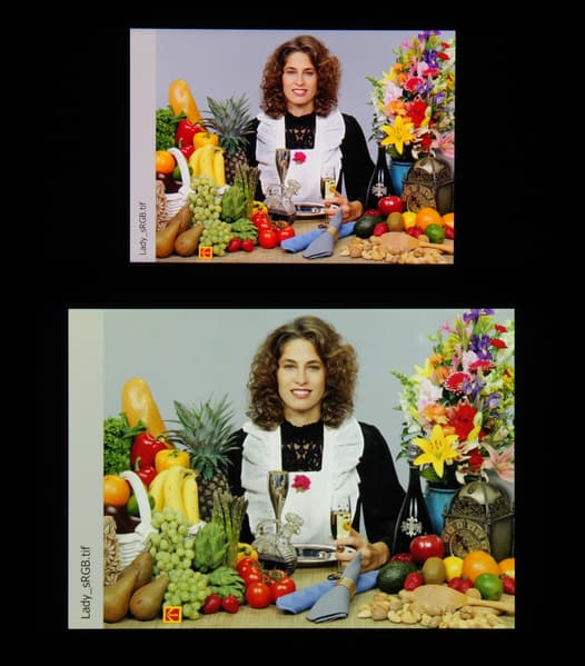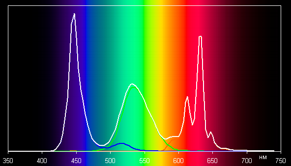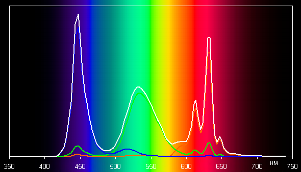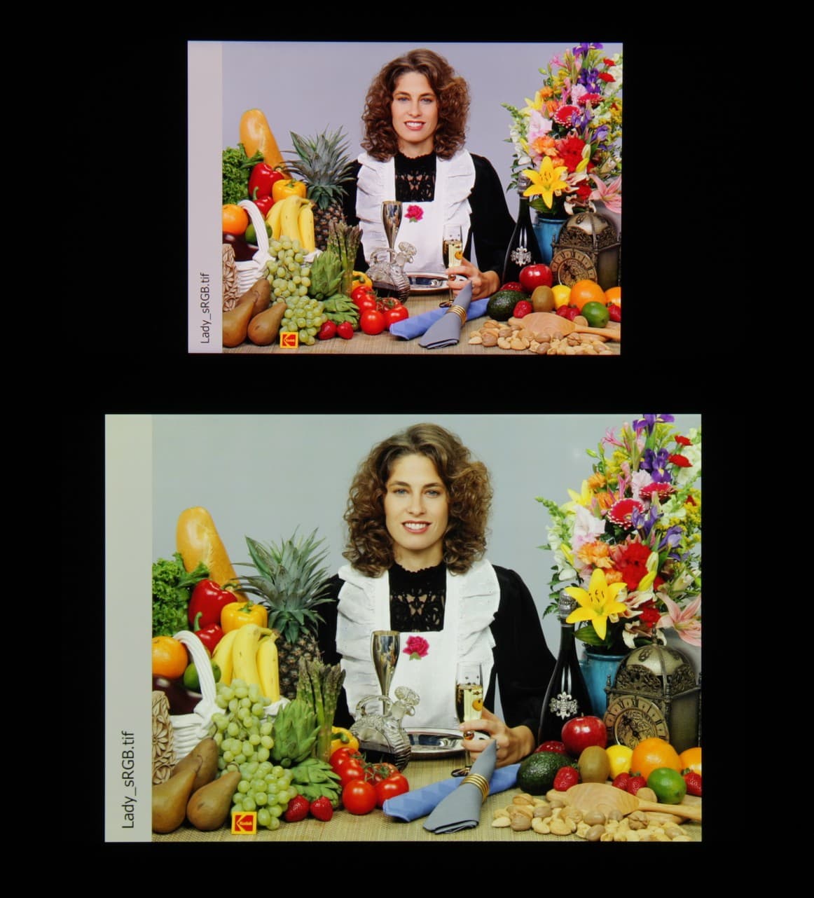 Спектры компонент достаточно хорошо разделены, что и обуславливает широкий цветовой охват. Для потребительского устройства широкий цветовой охват является недостатком, поскольку в итоге цвета изображений — рисунков, фотографий и фильмов, — ориентированных на пространство sRGB (а таких подавляющее большинство), имеют неестественную насыщенность. Особенно это заметно на узнаваемых оттенках, например на оттенках кожи. Результат приведен на фотографиях выше. Впрочем, не все так плохо: при выборе профиля Мягкий охват сжимается до границ sRGB.