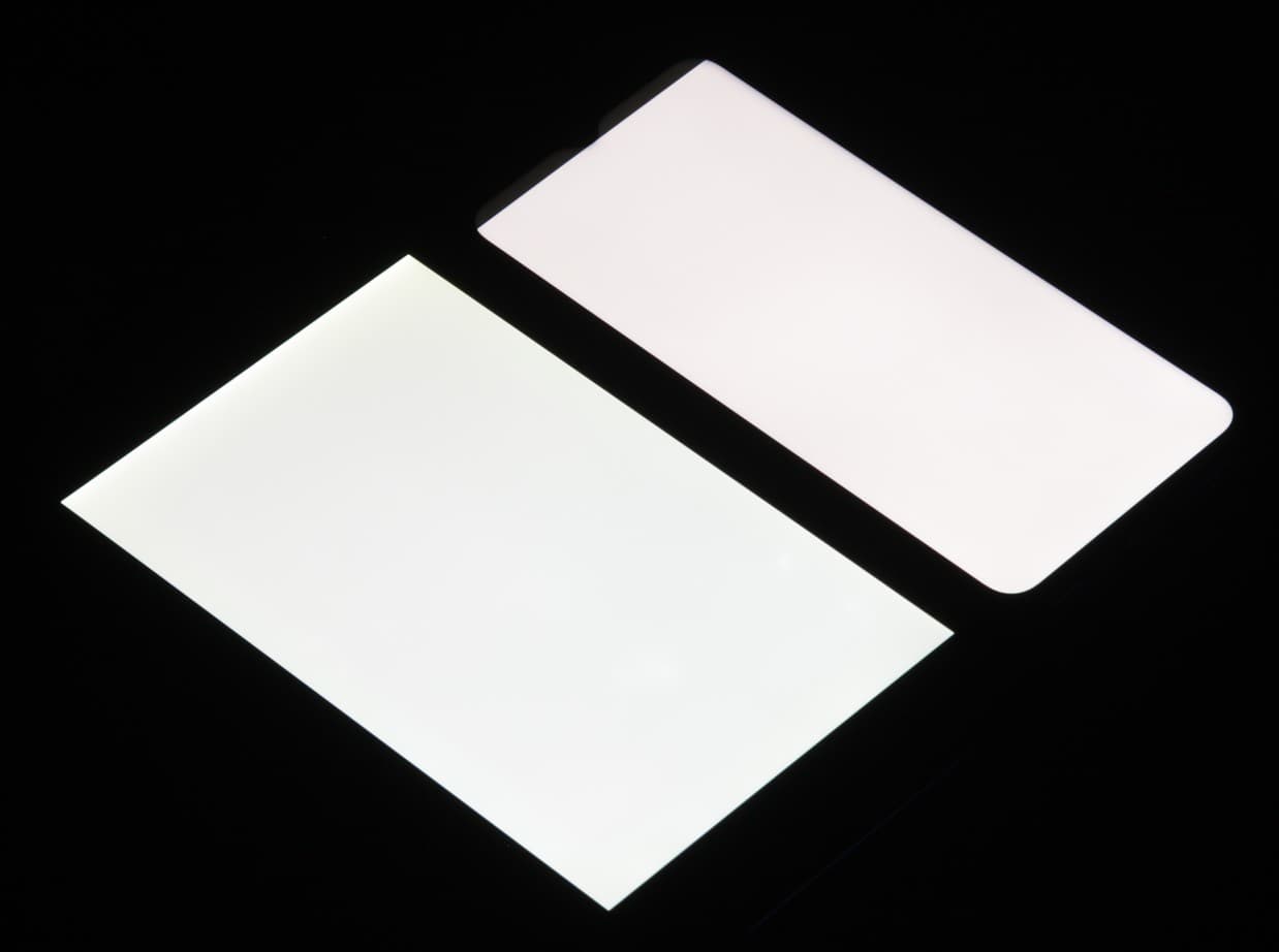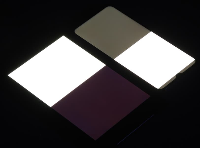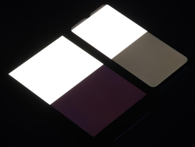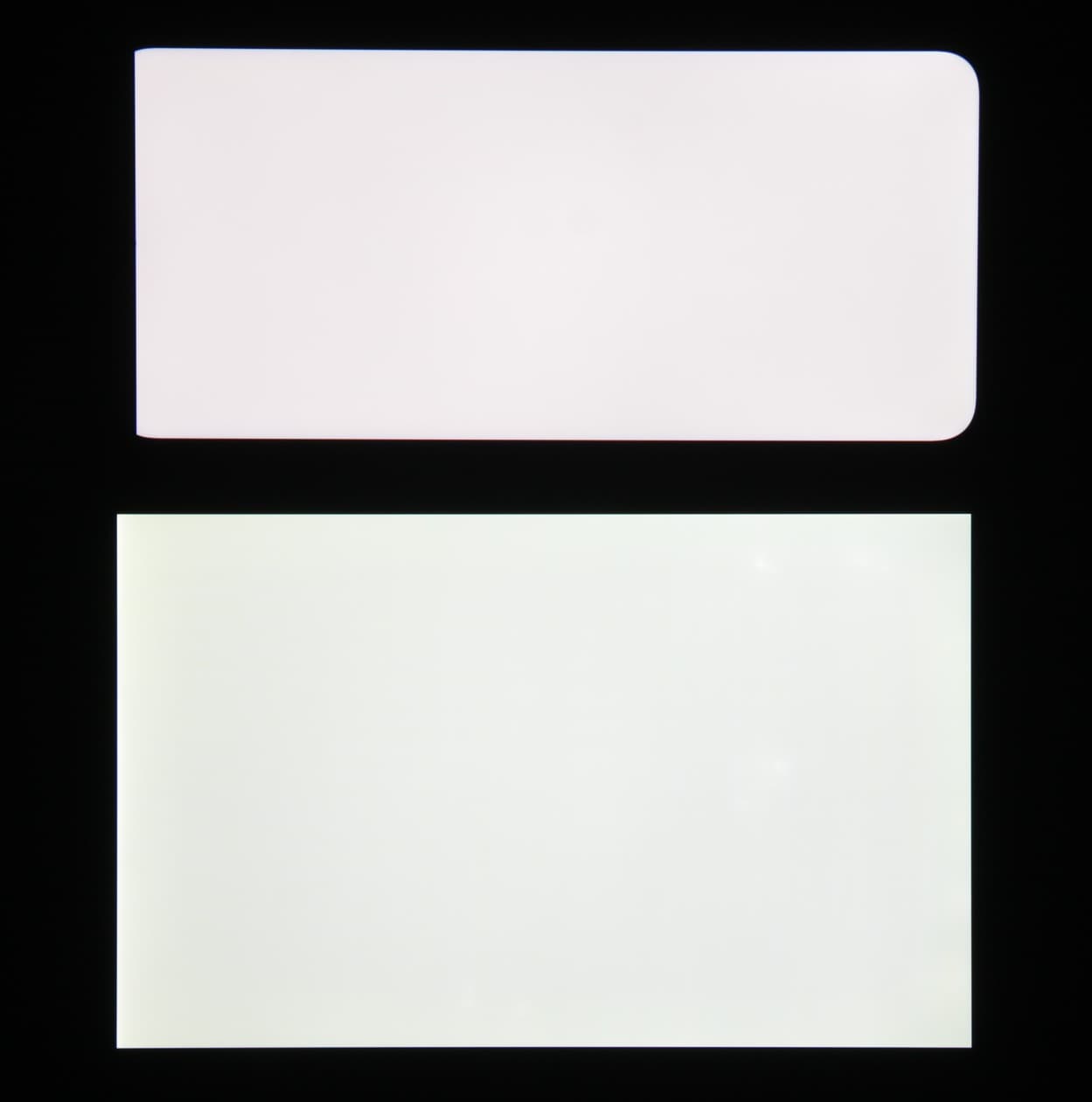 Яркость под углом у экранов уменьшилась (как минимум в 5 раз, исходя из разницы в выдержке), и уменьшилась примерно одинаково. Черное поле при отклонении по диагонали высветляется сильно, но остается условно нейтрально-серым (так видно глазами). Фотографии ниже это демонстрируют (яркость белых участков в перпендикулярном плоскости экранов направлении одинаковая!):
