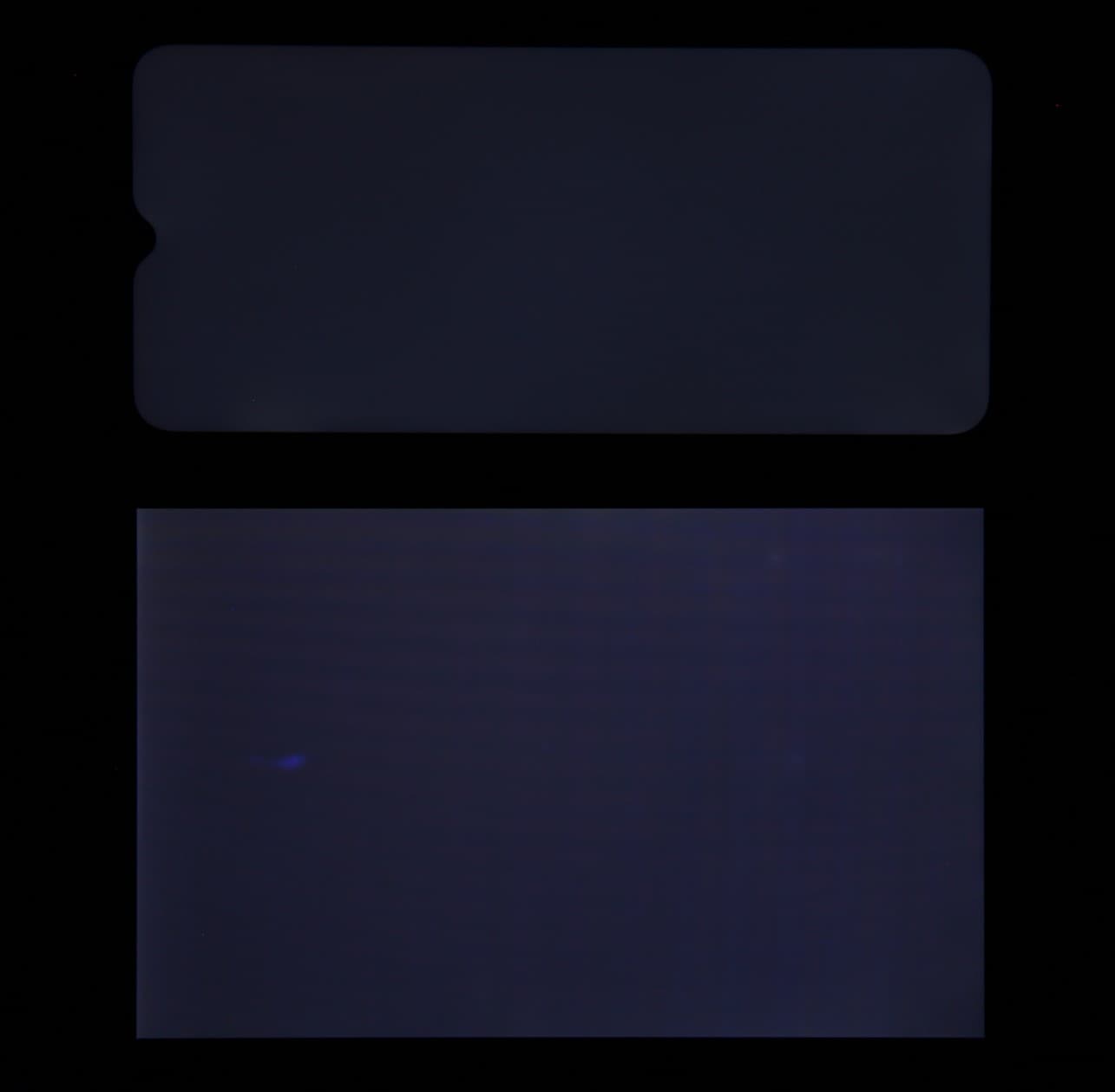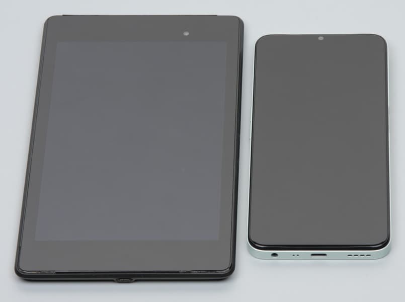 Лицевая поверхность экрана выполнена в виде стеклянной пластины с зеркально-гладкой поверхностью, устойчивой к появлению царапин. Судя по отражению объектов, антибликовые свойства экрана лучше, чем у экрана Google Nexus 7 (2013) (далее просто Nexus 7). Для наглядности приведем фотографию, на которой в выключенных экранах отражается белая поверхность (слева — Nexus 7, справа — Realme C35, далее их можно различать по размеру):