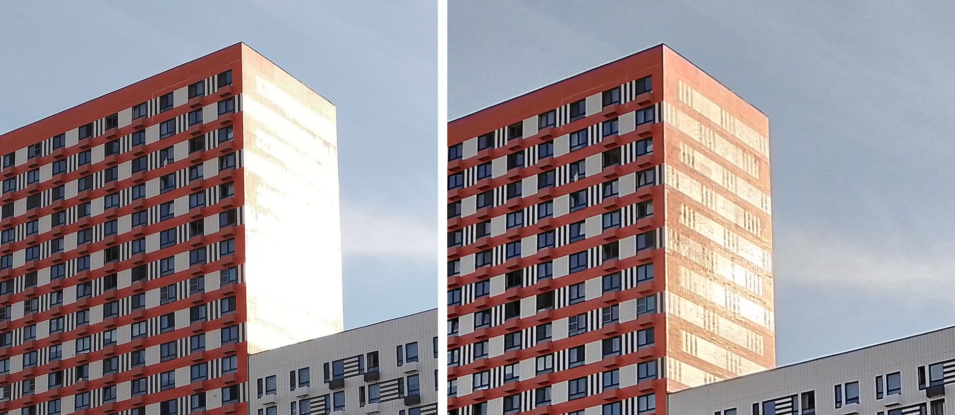Можно снимать с функцией объединения пикселей в 12,5 Мп или в полном 50-мегапиксельном разрешении. В автоматическом режиме по умолчанию камера не только добавляет контрастности и резкости, придавая картинке объема, из-за чего фото иногда смотрится выигрышнее, но и автоматически задействует режим HDR. С одной стороны, это позволяет «вытянуть» те места, с которыми в полном 50-мегапиксельном разрешении камера вообще не справляется.