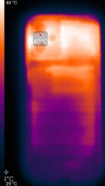 Нагрев больше в верхней части аппарата, что, видимо, соответствует расположению микросхемы SoC. По данным теплокамеры, максимальный нагрев составил 40 градусов (при температуре окружающего воздуха в 24 градуса), это средний нагрев в данном тесте для современных смартфонов.