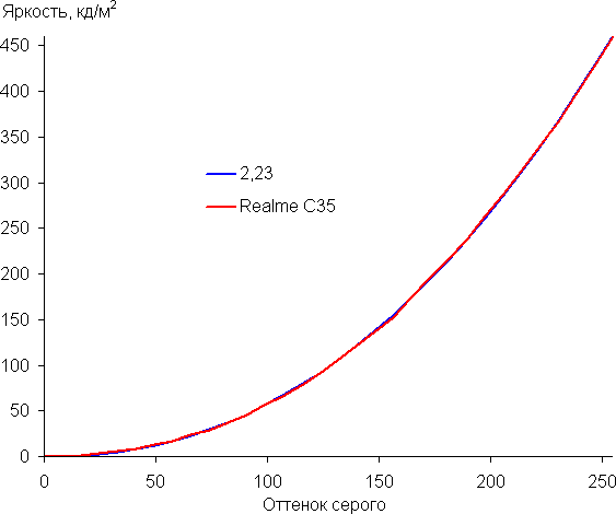 Контрастность (примерно в центре экрана) высокая — порядка 1200:1. Время отклика при переходе черный-белый-черный равно 18 мс (9 мс вкл. + 9 мс выкл.). Переход между полутонами серого 25% и 75% (по численному значению цвета) и обратно в сумме занимает 29 мс. Построенная по 32 точкам с равным интервалом по численному значению оттенка серого гамма-кривая не выявила завала ни в светах, ни в тенях. Показатель аппроксимирующей степенной функции равен 2,23, что чуть-чуть выше стандартного значения 2,2. При этом реальная гамма-кривая мало отклоняется от степенной зависимости: