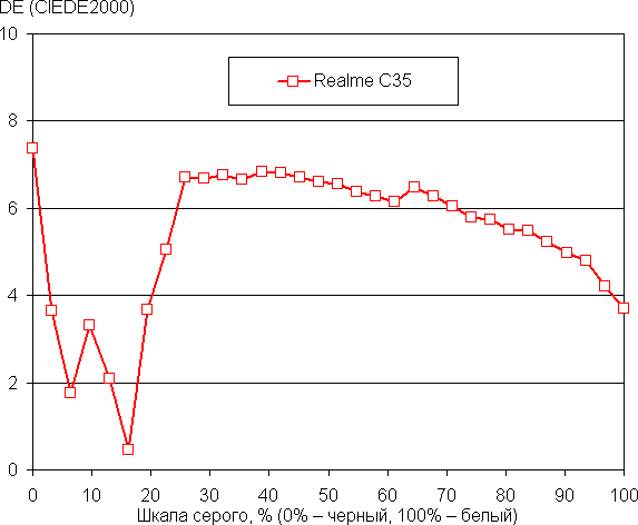 По умолчанию цветовая температура существенно выше стандартных 6500 К. Однако, в этом устройстве есть возможность скорректировать цветовой баланс с помощью регулировки оттенка (см. снимок выше). К сожалению, при выборе профиля Мягкий, в котором цвета естественные, регулировки оттенка недоступны. Впрочем, отклонение от спектра абсолютно черного тела (ΔE) на шкале серого остается ниже 10, что для потребительского устройства считается приемлемым показателем. При этом цветовая температура и ΔE на большей части шкалы серого мало изменяются от оттенка к оттенку — это положительно сказывается на визуальной оценке цветового баланса. (Самые темные области шкалы серого можно не учитывать, так как там баланс цветов не имеет большого значения, да и погрешность измерений цветовых характеристик на низкой яркости большая.)