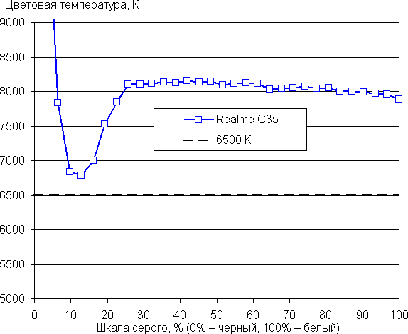 Цвета на экране Realme C35 явно перенасыщены, а цветовой баланс у экранов различается. Напомним, что фотография не может служить надежным источником сведений о качестве цветопередачи и приводится только для условной наглядной иллюстрации. Причина в том, что спектральная чувствительность матрицы фотоаппарата неточно совпадает с этой характеристикой человеческого зрения.