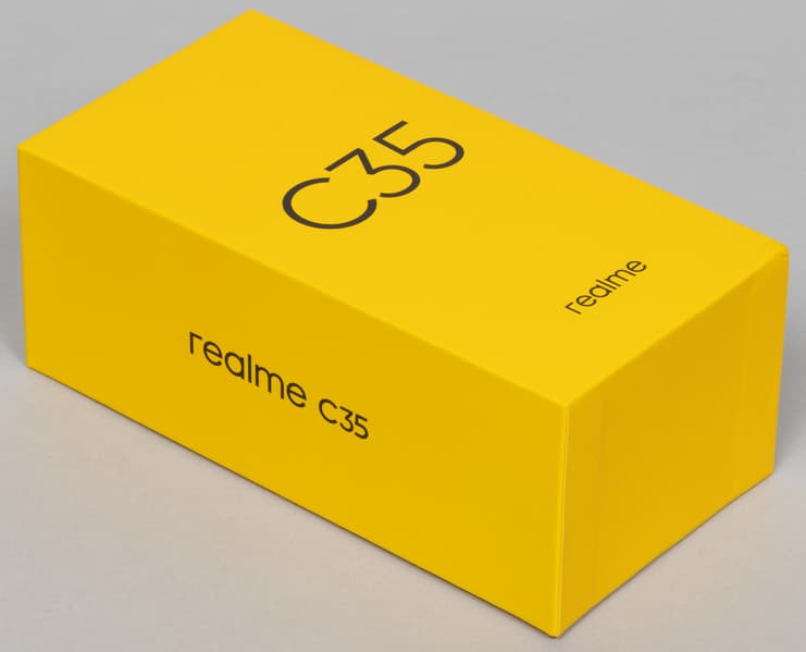 Realme C35 поставляется в прочной картонной упаковке с привычным желто-черным оформлением и скудной комплектацией.