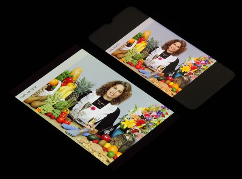 Экран имеет хорошие углы обзора без значительного сдвига цветов даже при больших отклонениях взгляда от перпендикуляра к экрану и без инвертирования оттенков. Для сравнения приведем фотографии, на которых на экраны Realme C35 и Nexus 7 выведены одинаковые изображения, при этом яркость экранов изначально установлена примерно на 200 кд/м², а цветовой баланс на фотоаппарате принудительно переключен на 6500 К.