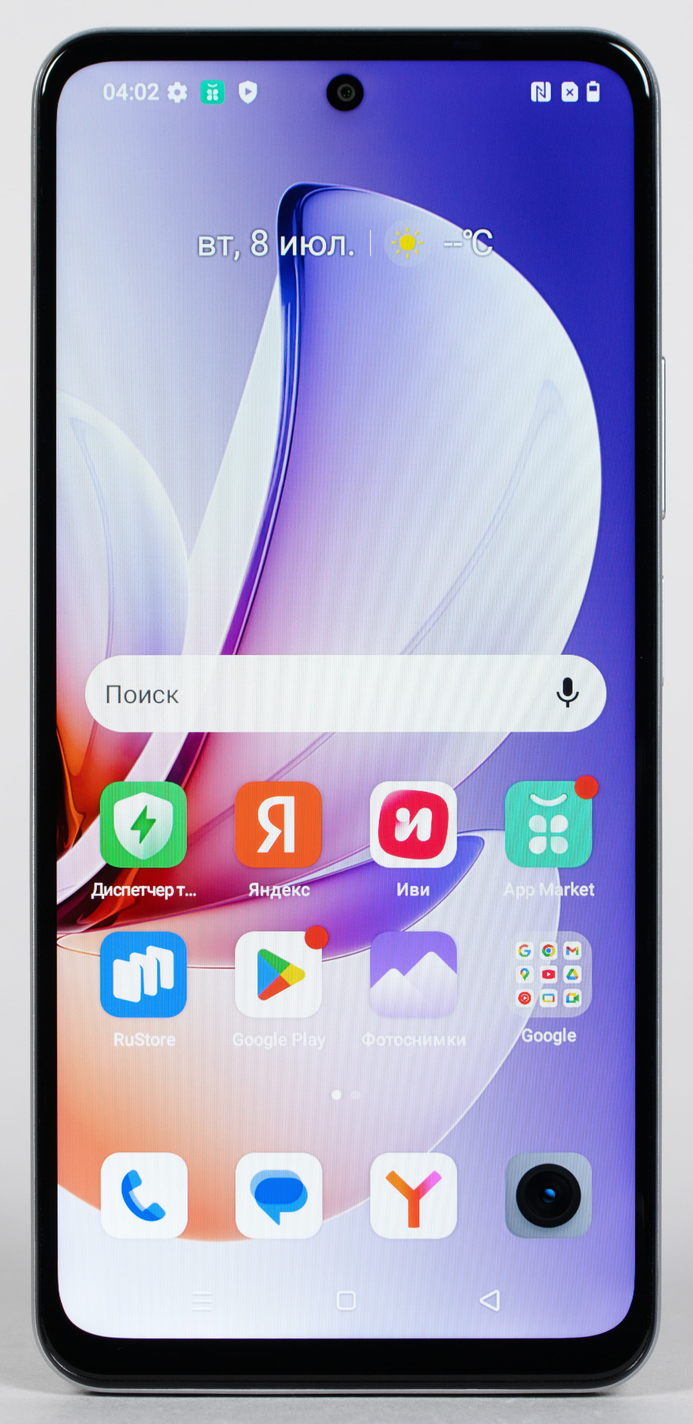 Экран прикрыт плоским стеклом без загнутых краев. Одиночный глазок фронтальной камеры установлен за круглым вырезом в матрице экрана. Рамка вокруг дисплея смотрится довольно широкой, особенно нижний ее сегмент.