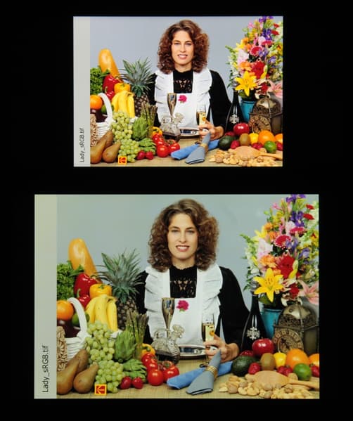 Отметим, что на экранах с широким цветовым охватом (без соответствующей коррекции) цвета́ обычных изображений, оптимизированных для устройств sRGB, выглядят неестественно насыщенными. Отсюда и рекомендация: в большинстве случаев смотреть кино, фотографии и все естественное лучше при выборе профиля Естественный.