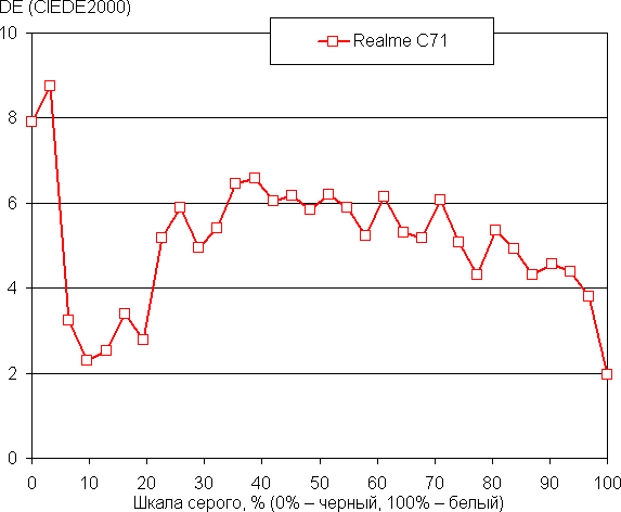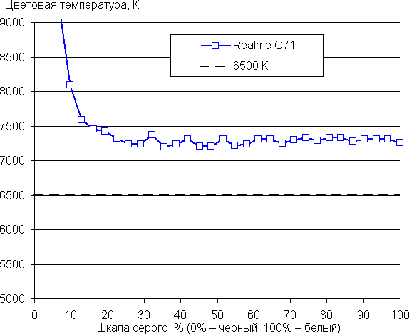 В этом устройстве есть возможность скорректировать цветовой баланс с помощью регулировки оттенка на цветовом круге или просто выбором одного из трех предустановленных профилей. К сожалению, при выборе профиля Естественный, в котором нет увеличения цветового охвата, эти настройки заблокированы. В этом профиле баланс оттенков на шкале серого приемлемый, так как цветовая температура не сильно выше стандартных 6500 К и отклонение от спектра абсолютно черного тела (ΔE) ниже 10, что для потребительского устройства считается хорошим показателем. При этом цветовая температура и ΔE мало изменяются от оттенка к оттенку — это положительно сказывается на визуальной оценке цветового баланса. (Самые темные области шкалы серого можно не учитывать, так как там баланс цветов не имеет большого значения, да и погрешность измерений цветовых характеристик на низкой яркости большая.)