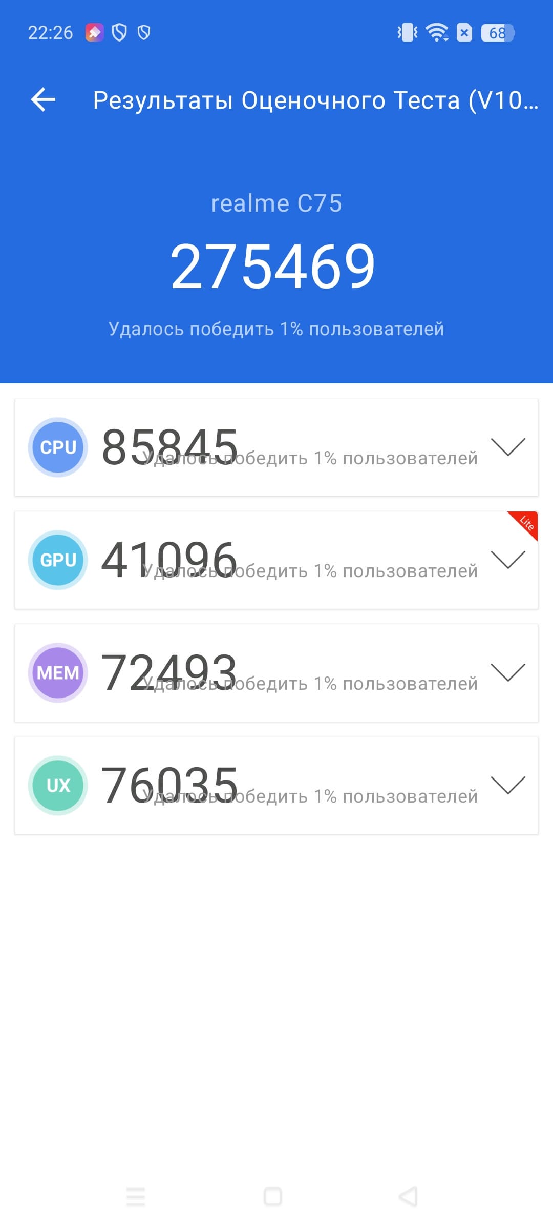 Realme C75 — это один из самых доступных смартфонов производителя, и его возможности полностью соответствуют бюджетному уровню. Из положительных моментов здесь хороший экран, хоть и IPS, достаточно высокая автономность, привлекательный современный внешний вид и всевозможная защита корпуса, включая некую защиту от ударов. В остальном это действительно базовый уровень. Качество фото- и видеосъемки с прошлого поколения не улучшили, стереодинамики и поддержку сетей 5G не добавили, да еще и убрали зачем-то разъем для проводной гарнитуры. Аппаратная платформа была переименована, но мощнее от этого почему-то не стала. В целом, это чуть перелицованное прошлое поколение: если вам нужен подобный смартфон и вы не купили его годом раньше, то теперь можно купить этот.
