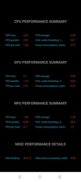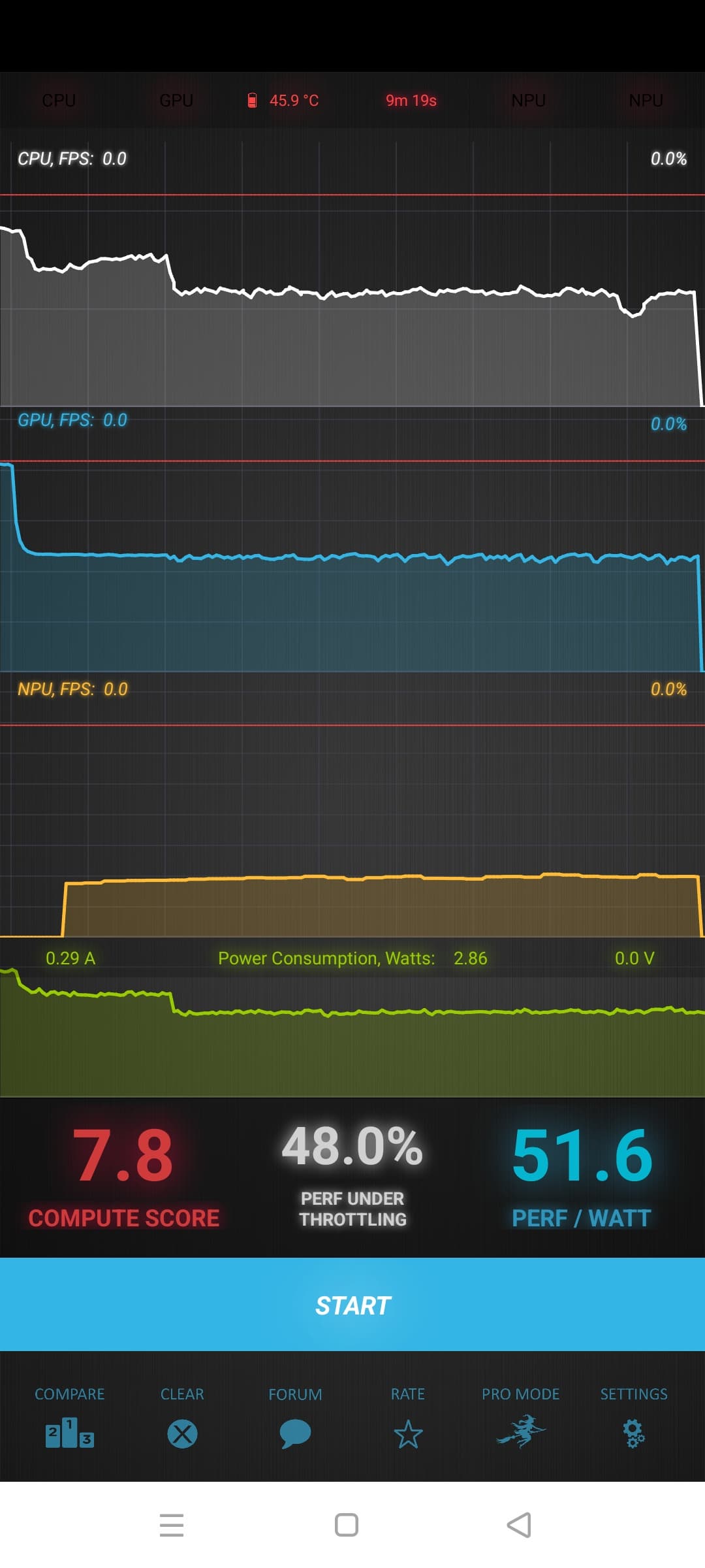 Тест на снижение производительности при нагреве мы проводим с помощью программы Burnout Benchmark, которая позволяет нагружать CPU, GPU и NPU: