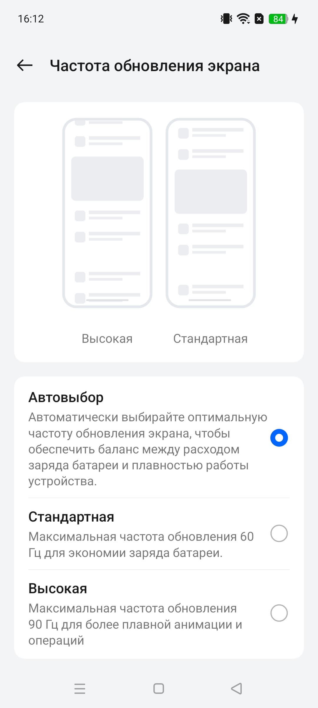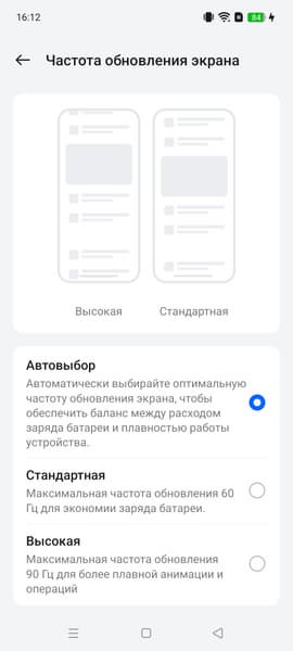 В настройках экрана можно включить режим с повышенной до 90 Гц частотой обновления, притом в режиме Автовыбор нам обещают автоматический выбор частоты: