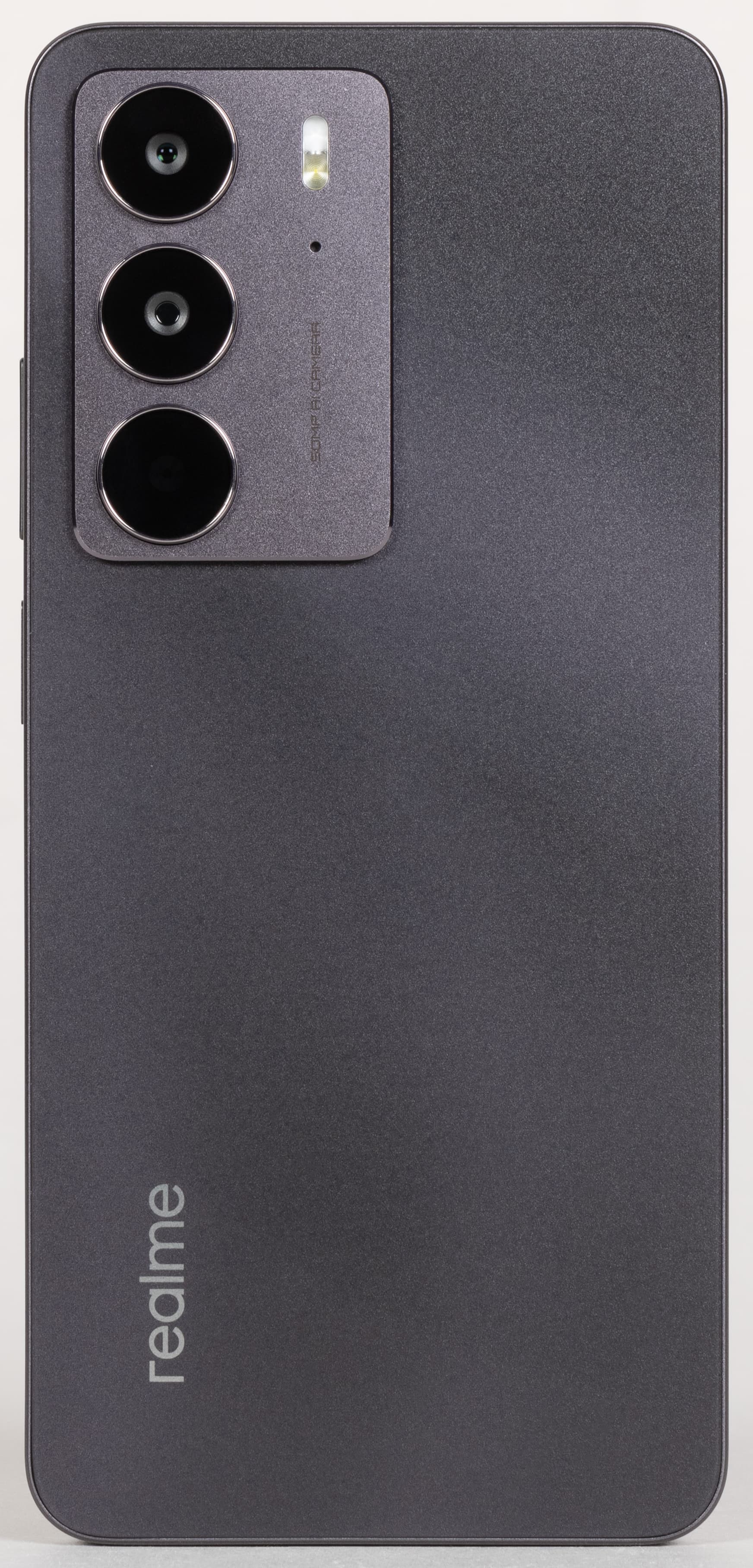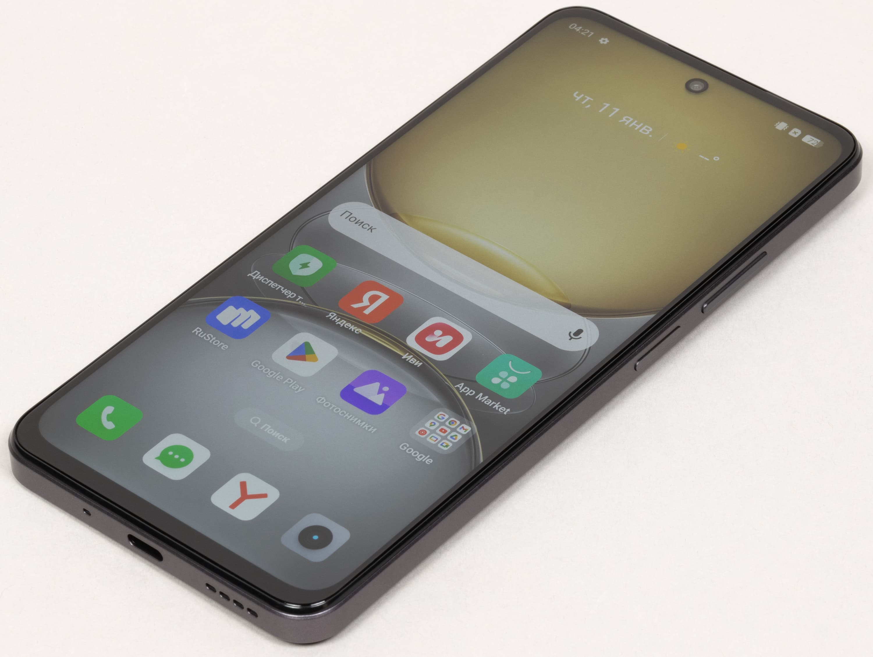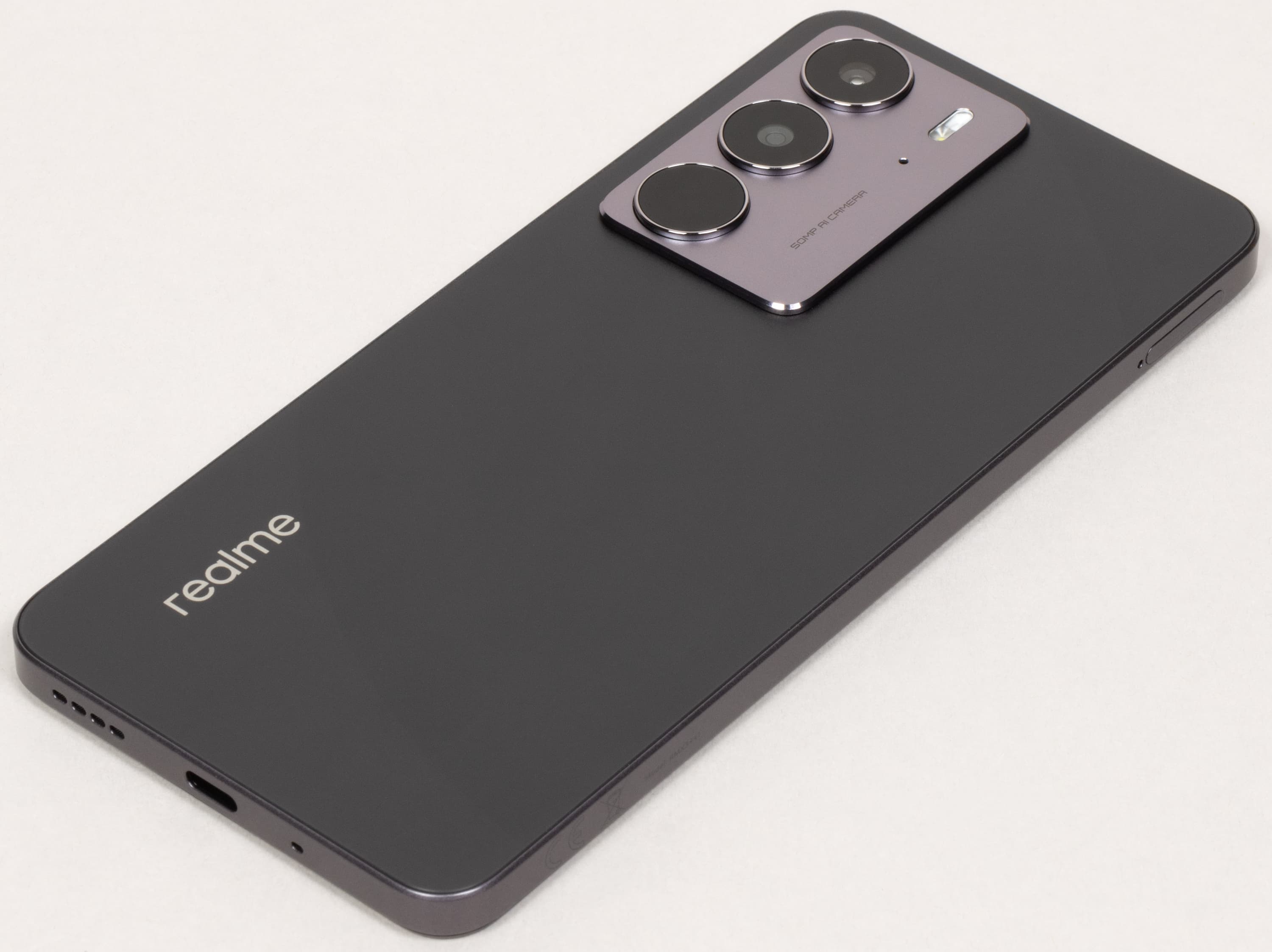 У Realme C75 современный дизайн с актуальными плоскими передней и задней панелями и широкими плоскими боковинами. Здесь нет ни закруглений к бокам, ни зауженных граней, ни загнутых стекол. За счет всего этого корпус не прокручивается в ладони, удерживается в руке надежно.
