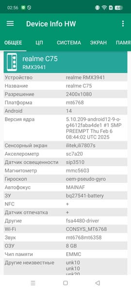 Realme C75 поддерживает мобильные сети вплоть до 4G, два диапазона Wi-Fi 5 и Bluetooth 5.0, есть поддержка NFC. Поддержки e-SIM нет. На практике в пределах городской черты московского региона аппарат демонстрирует уверенную работу в беспроводных сетях, не теряет связь, быстро восстанавливает связь после вынужденного обрыва. Все необходимые встроенные датчики на месте. Приятно, что не сэкономили даже на гироскопе.