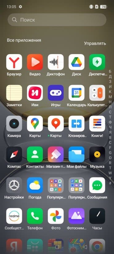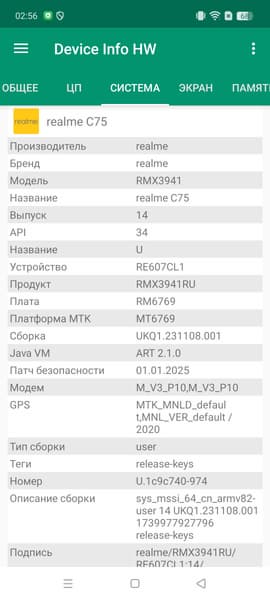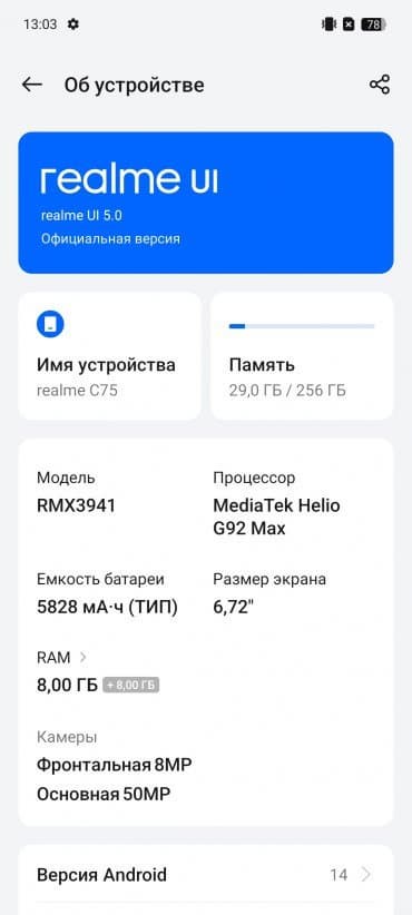 В качестве программной платформы в Realme C75 используется интерфейс Realme UI 5.0 на основе ОС Android 14. Стандартный для всех смартфонов Realme добротный интерфейс хорошо нам знаком и лаконичен. Даже несмотря на слабый процессор, он работает плавно и без притормаживаний.