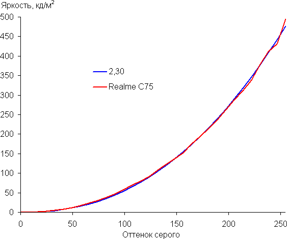 Контрастность (примерно в центре экрана) высокая — порядка 1600:1. Время отклика при переходе черный-белый-черный равно 18 мс (9 мс вкл. + 9 мс выкл.). Переход между полутонами серого 25% и 75% (по численному значению цвета) и обратно в сумме занимает 31 мс. Построенная по 32 точкам с равным интервалом по численному значению оттенка серого гамма-кривая не выявила завала ни в светах, ни в тенях. Показатель аппроксимирующей степенной функции равен 2,30, что выше стандартного значения 2,2. При этом реальная гамма-кривая местами отклоняется от степенной зависимости: