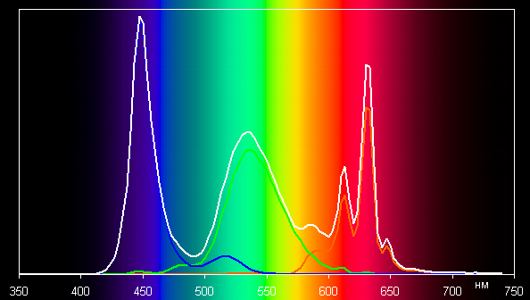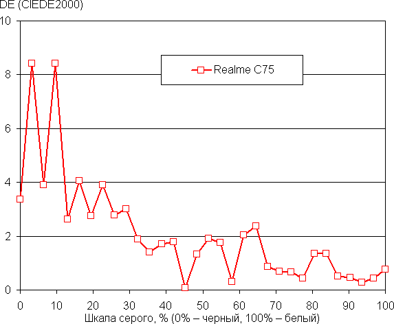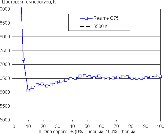 В этом устройстве есть возможность скорректировать цветовой баланс с помощью выбора профиля цветовой температуры или регулировки оттенка на цветовом круге. Баланс оттенков на шкале серого после выбора профиля Естественный без коррекции немного компромиссный, так как цветовая температура заметно выше стандартных 6500 К. Коррекцией (точка на круге — как на снимке выше) цветовой баланс удается улучшить — цветовая температура близка к стандартным 6500 К, и отклонение от спектра абсолютно черного тела (ΔE) ниже 10, что для потребительского устройства считается приемлемым показателем. При этом цветовая температура и ΔE мало изменяются от оттенка к оттенку — это положительно сказывается на визуальной оценке цветового баланса. (Самые темные области шкалы серого можно не учитывать, так как там баланс цветов не имеет большого значения, да и погрешность измерений цветовых характеристик на низкой яркости большая.)