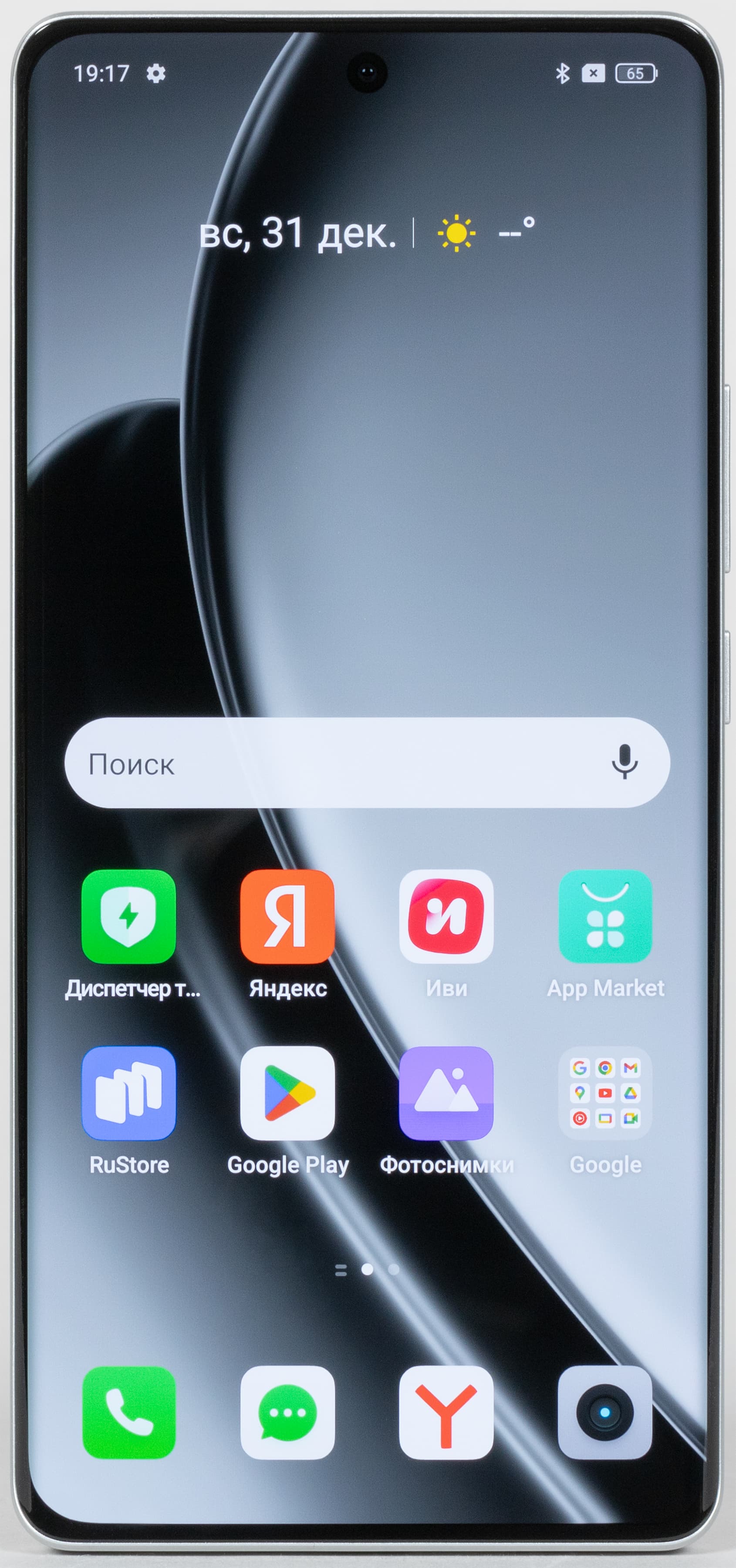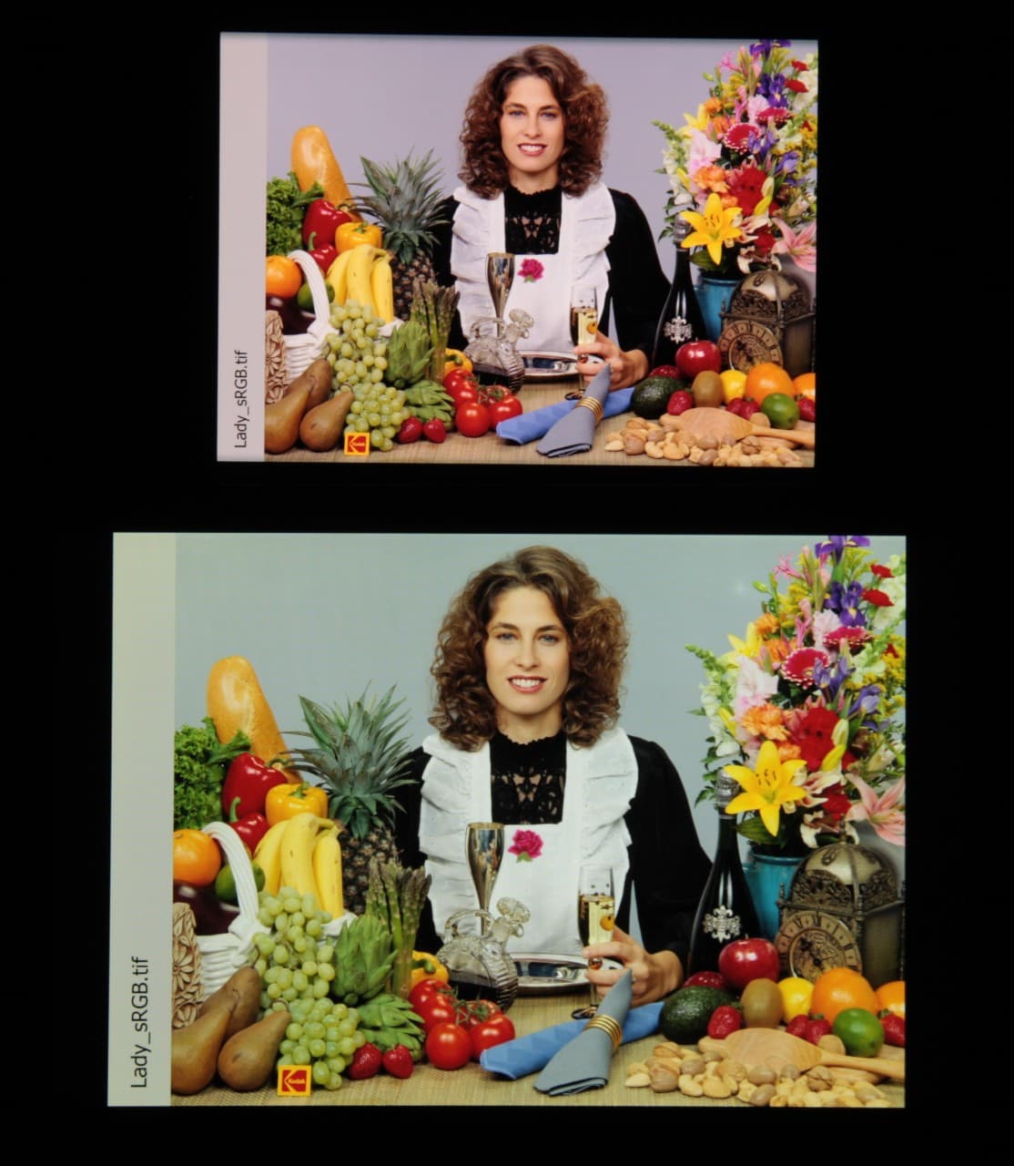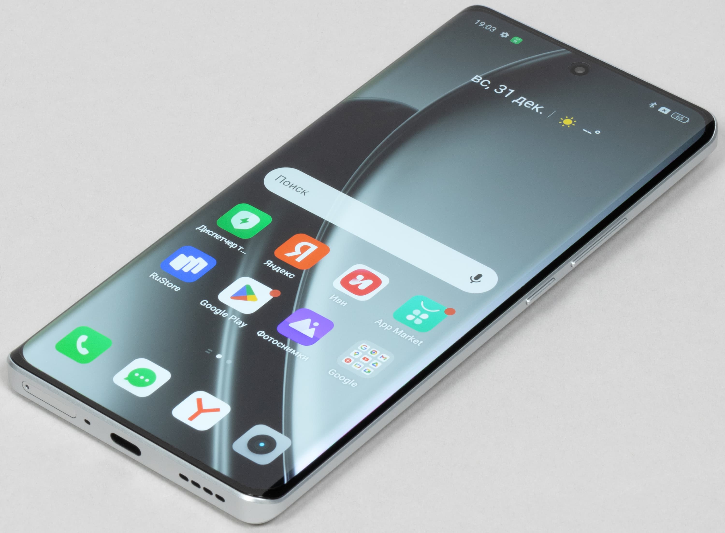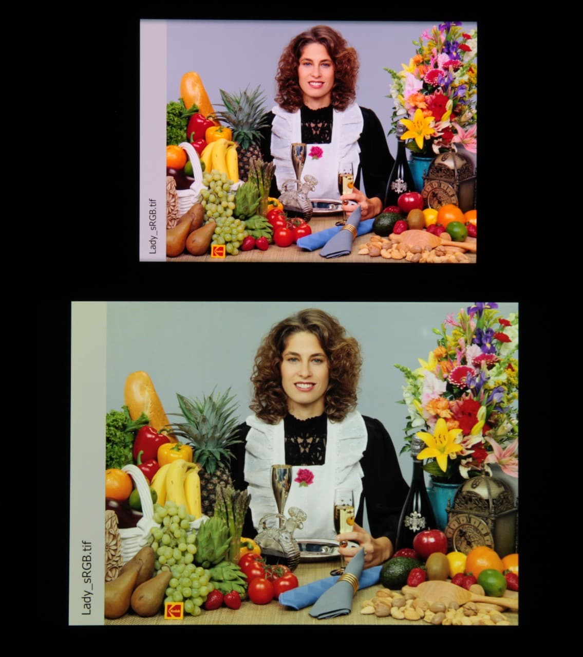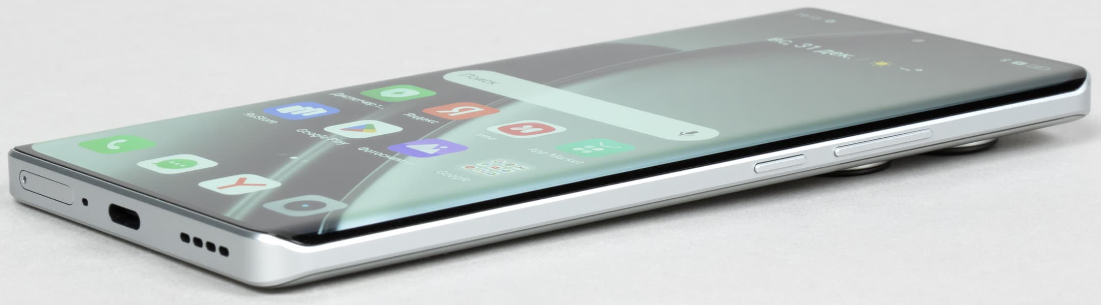 Цвета на экране смартфона перенасыщены (обратите внимание на помидоры, бананы, салфетку и оттенок лица), а цветовой баланс заметно отличается. Напомним, что фотография не может служить надежным источником сведений о качестве цветопередачи и приводится только для условной наглядной иллюстрации. В частности, выраженный красноватый оттенок белого и серого полей, присутствующий на фотографиях экрана смартфона, при перпендикулярном взгляде визуально отсутствует, что подтверждается аппаратными тестами с помощью спектрофотометра. Причина в том, что спектральная чувствительность матрицы фотоаппарата неточно совпадает с этой характеристикой человеческого зрения. Заметим, что в данном случае картинка занимает в высоту (при ландшафтной ориентации экрана) всю доступную для вывода изображения область и заходит на загнутые края экрана, что приводит к легкому затемнению и искажению цвета. Также на свету эти области почти всегда бликуют, что еще больше мешает при просмотре изображений, выведенных на весь экран. И даже картинка фильмов с соотношением сторон 16:9 заходит на загибы, что мешает при просмотре кино.