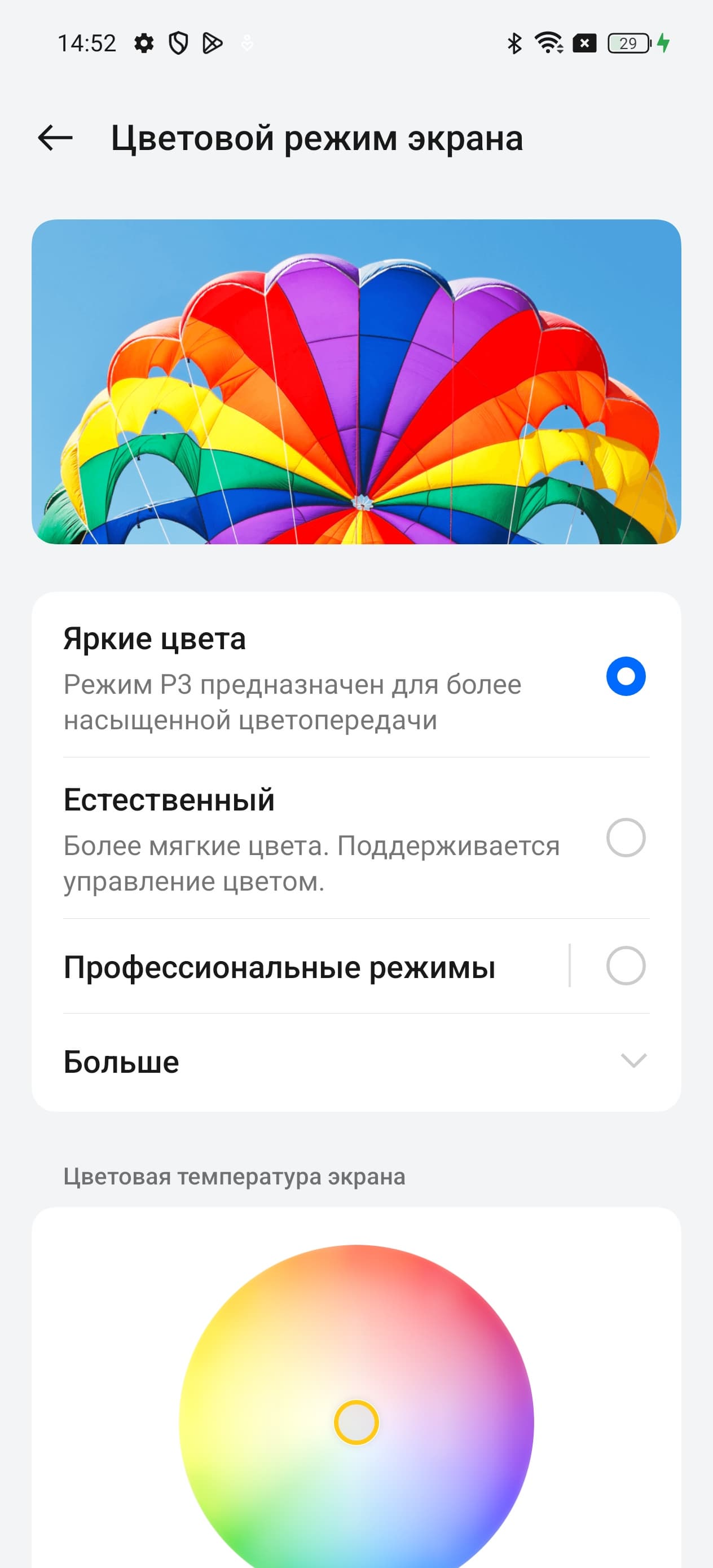Фотография выше получена для профиля Яркие цвета в настройках экрана, который выбран по умолчанию. Профилей всего четыре: