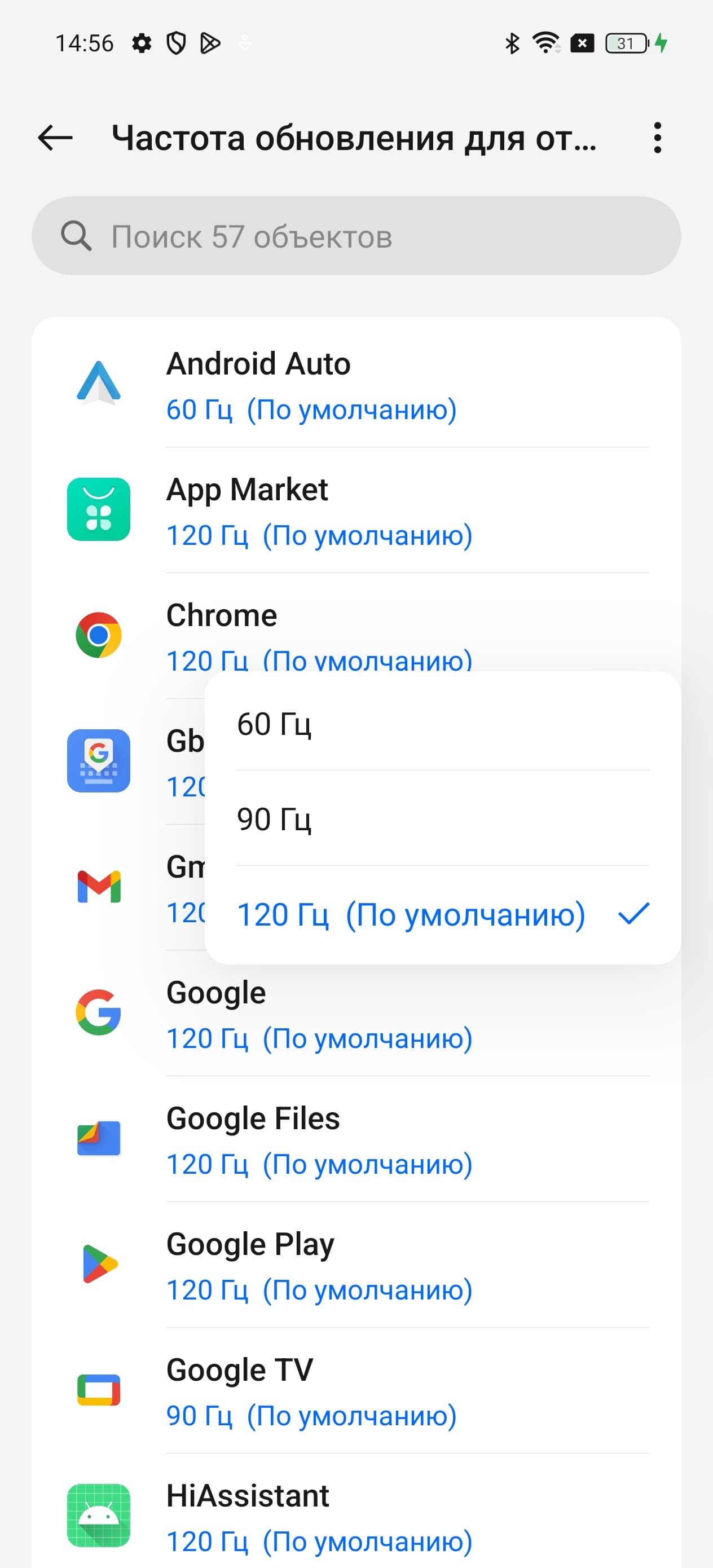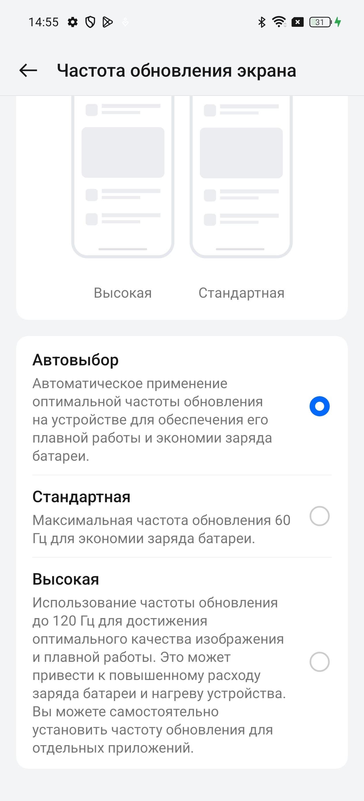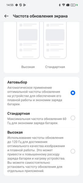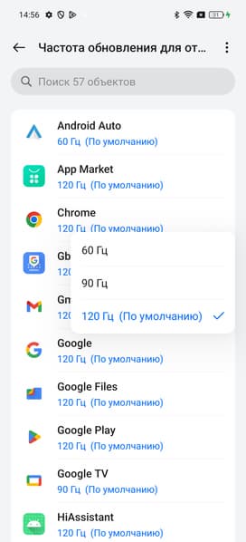 В настройках экрана можно включить режим с повышенной до 120 Гц частотой обновления, при этом для отдельных приложений можно установить свою максимальную частоту: