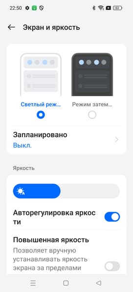 При ручном управлении яркостью и при выводе белого поля во весь экран максимальное значение яркости составило около 970 кд/м² (если включить ограничение на максимальную яркость, то 580 кд/м²), а на очень ярком свету оно может повышаться до 1580 кд/м². Максимальная яркость очень высокая. Также нужно учитывать, что в данном случае чем меньше площадь белого на экране, тем он светлее, то есть фактическая максимальная яркость белых участков будет почти всегда выше указанных значений. В итоге, учитывая отличные антибликовые свойства, читаемость днем на солнце, должна быть на хорошем уровне. Минимальное значение яркости — 1,6 кд/м², поэтому в полной темноте яркость можно понизить до комфортного значения. В наличии автоматическая регулировка яркости по датчику освещенности (он расположен под экраном правее камеры). В автоматическом режиме при изменении внешних условий освещенности яркость экрана как повышается, так и понижается. Работа этой функции зависит от положения ползунка регулировки яркости: им пользователь может попытаться выставить желаемый уровень яркости в текущих условиях. Если оставить все по умолчанию, то в полной темноте функция автояркости уменьшает яркость до 1,6 кд/м² (очень темно), в условиях освещенного искусственным светом офиса (примерно 550 лк) устанавливает на 140 кд/м² (нормально), в очень ярком окружении (условно соответствует нахождению на прямом солнечном свету) повышает до 1580 кд/м² (до максимума, так и нужно). Результат нас не совсем устроил, поэтому в полной темноте мы попробовали увеличить яркость, но приемлемого результата не добились, так как в темноте яркость устанавливалась непредсказуемым образом. Получается, что функция автоподстройки яркости работает не совсем адекватно.