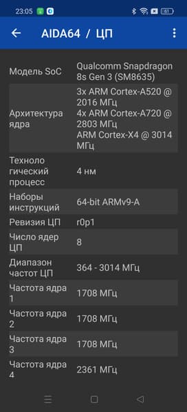 - SoC Qualcomm SM8635 Snapdragon 8s Gen3, 8 процессорных ядер (1×Cortex-X4 @3,0 ГГц + 4×Cortex-A720 @2,8 ГГц + 3×Cortex-A520 @2,0 ГГц)