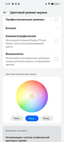 Дополнительно в этом устройстве есть возможность скорректировать цветовой баланс с помощью выбора профиля цветовой температуры или регулировки оттенка на цветовом круге. Но особого смысла это делать нет, достаточно выбрать профиль Естественный. Также в настройках можно уменьшить интенсивность синей компоненты.