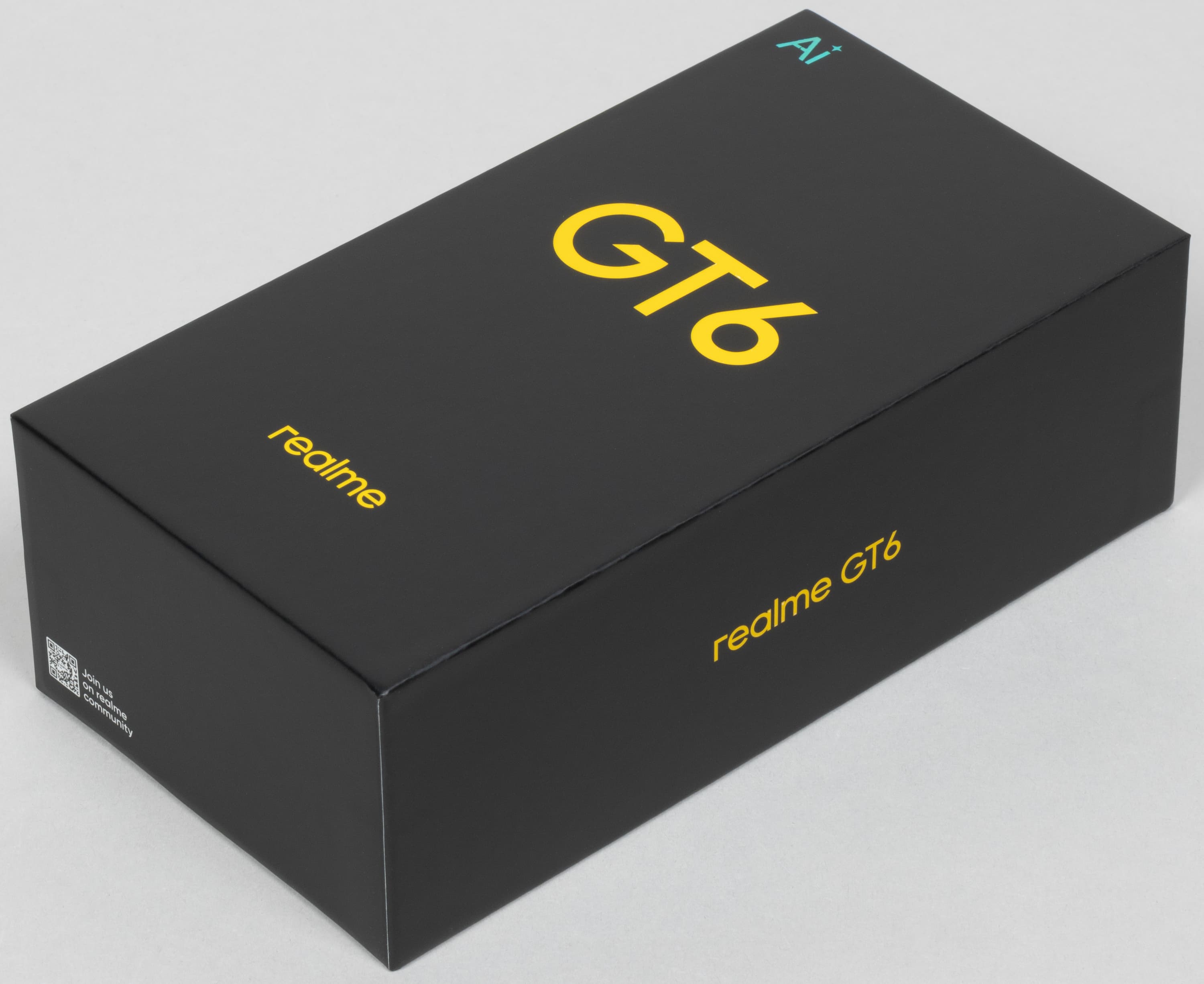 Смартфон Realme GT 6 поставляется в стандартной картонной коробке со стильным сдержанным оформлением.